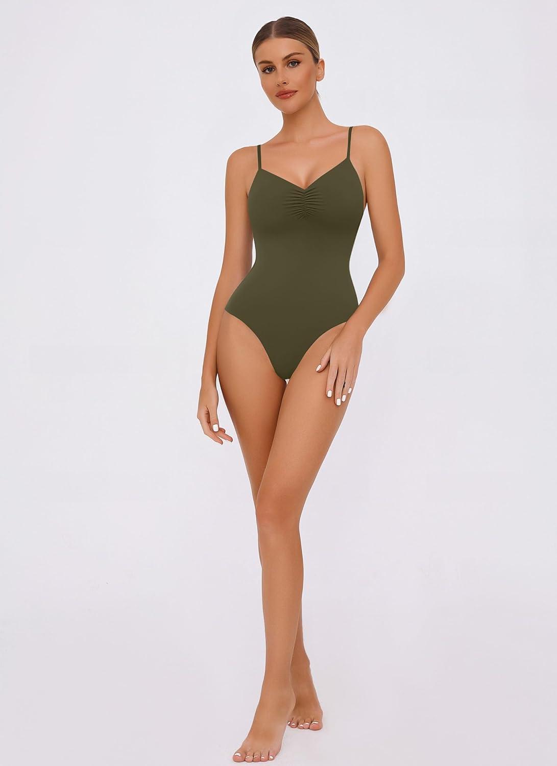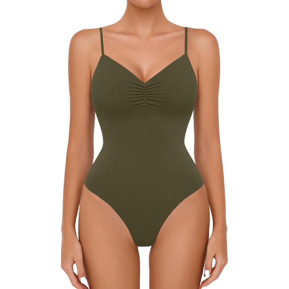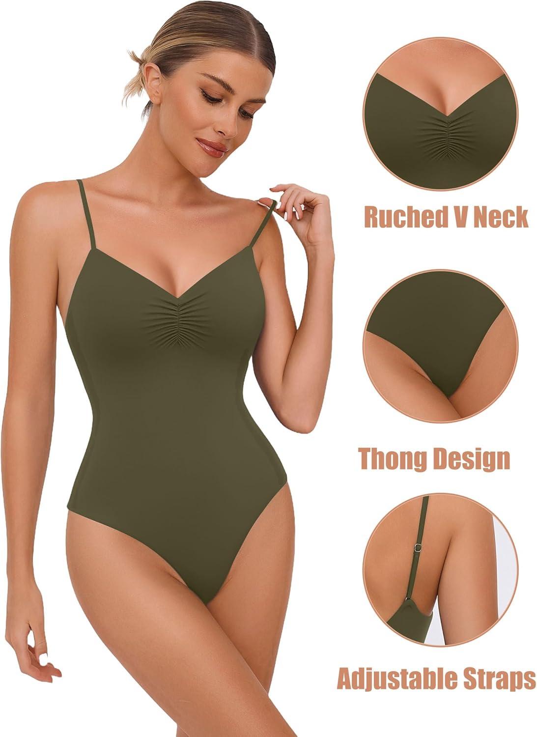 Avidlove Body Suits for Womens Sexy Ruched V Neck Thong Bodysuit Backless Sleeveless Double Lined Cami Body Suit Top(Army Green)