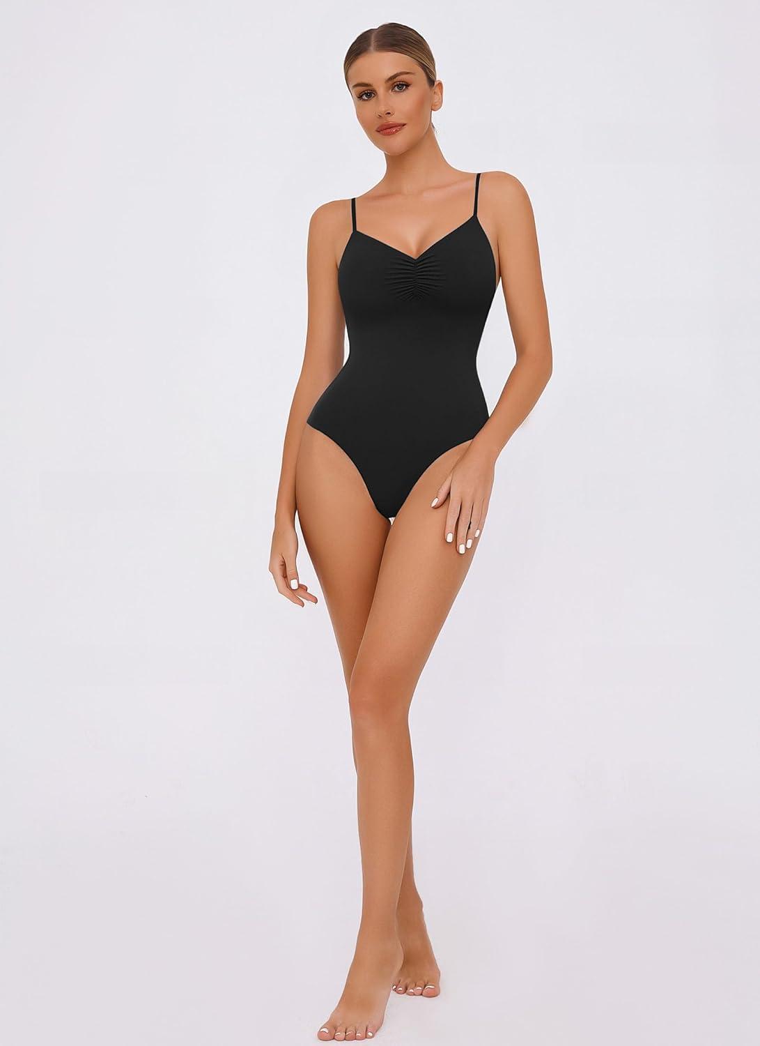 Avidlove Body Suits for Womens Sexy Ruched V Neck Thong Bodysuit Backless Sleeveless Double Lined Cami Body Suit Top(Black)