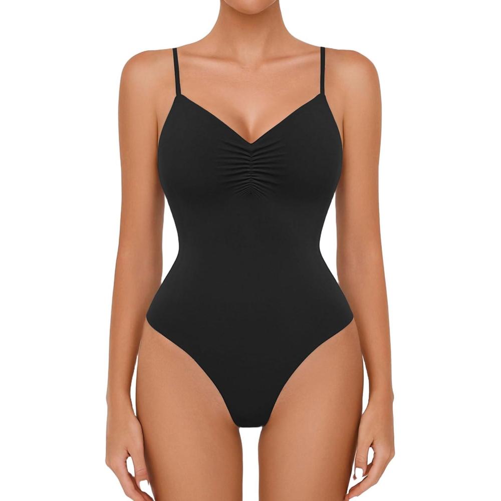 imageAvidlove Body Suits for Womens Sexy Ruched V Neck Thong Bodysuit Backless Sleeveless Double Lined Cami Body Suit TopBlack