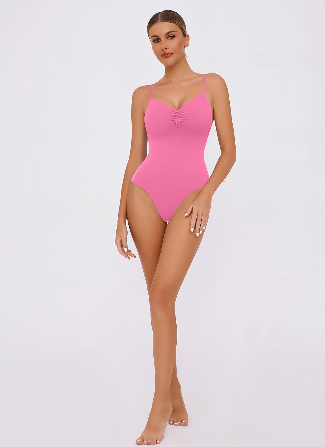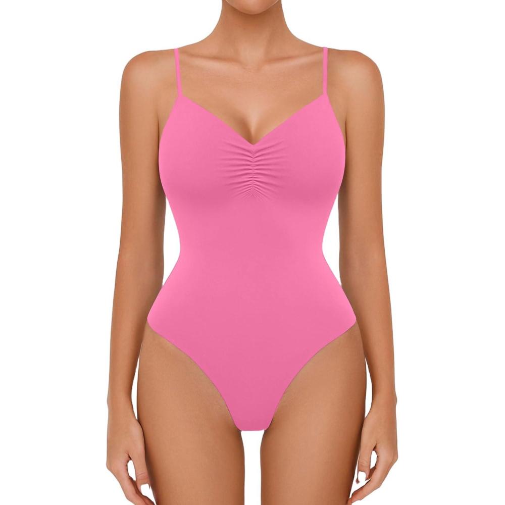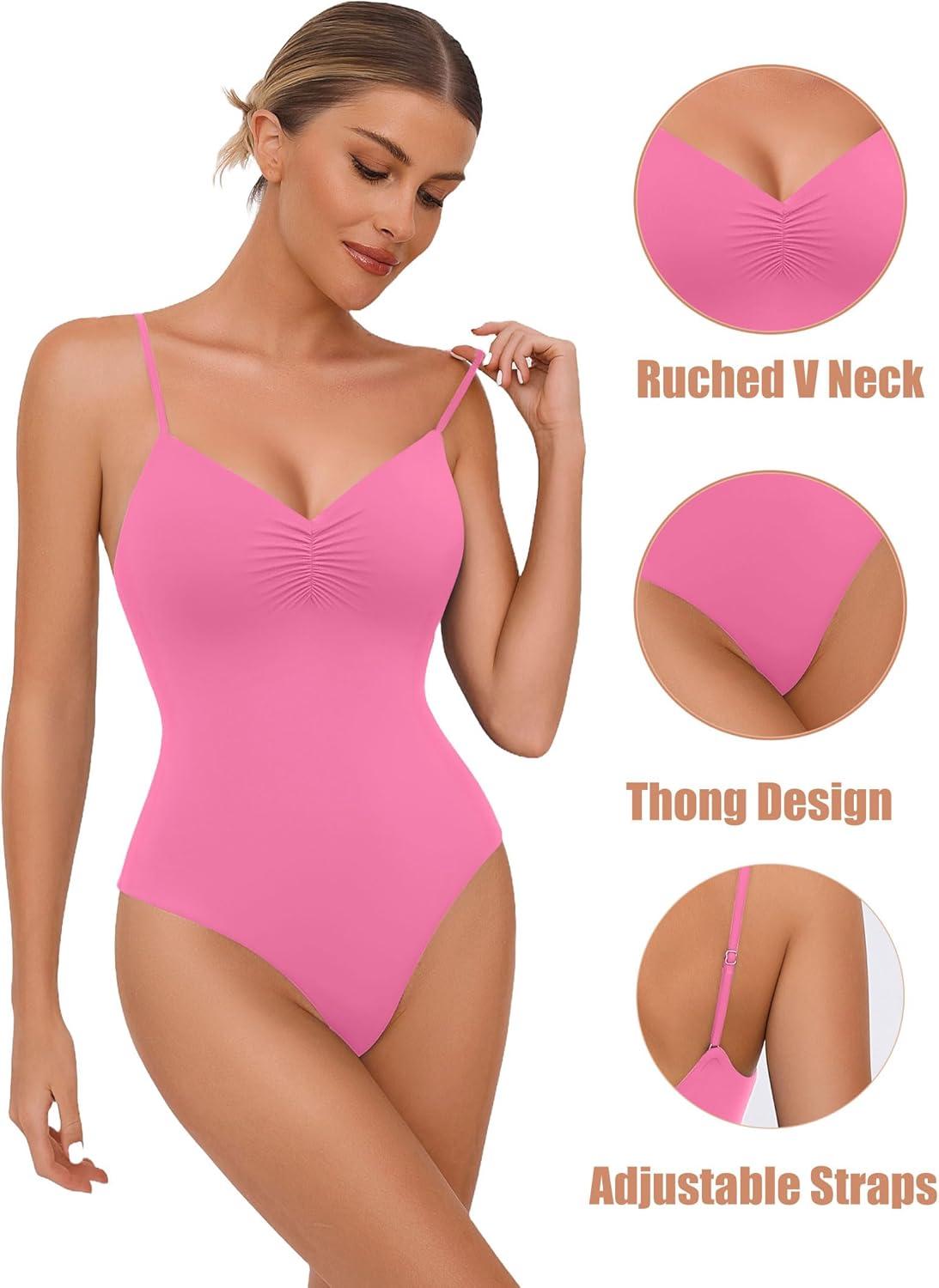 imageAvidlove Body Suits for Womens Sexy Ruched V Neck Thong Bodysuit Backless Sleeveless Double Lined Cami Body Suit TopPink