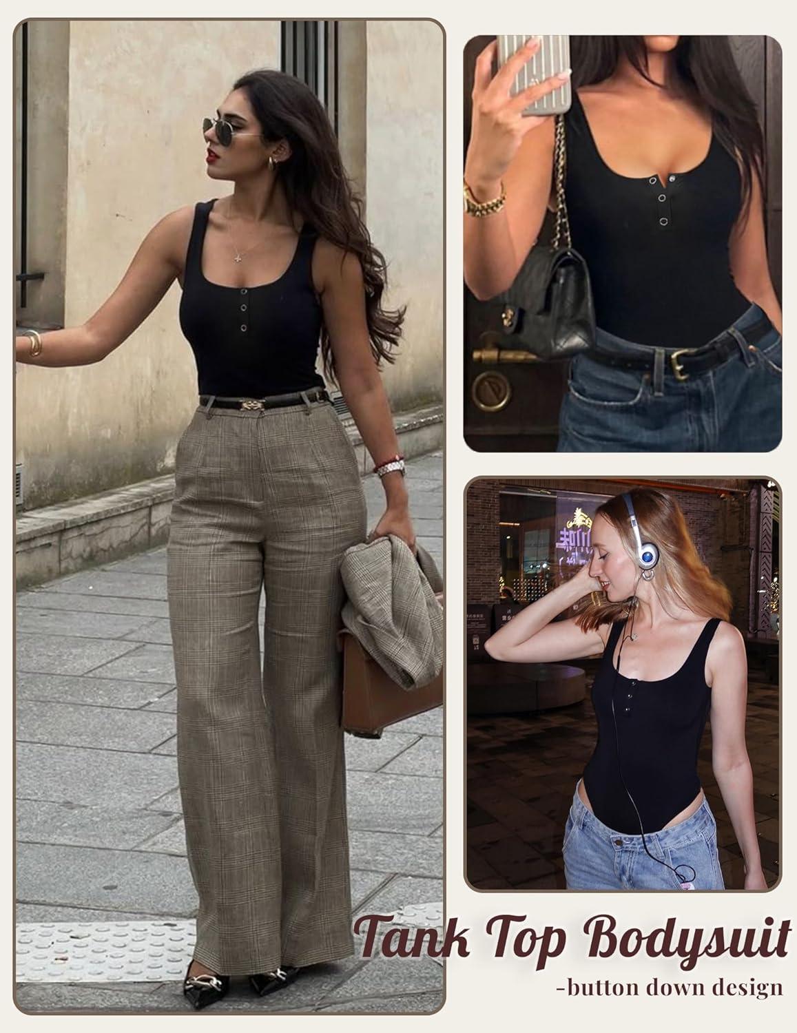 Avidlove Bodysuits for Women Button Down Square Neck Sleeveless Body Suit Snap Closure Double Lined Tank Tops Bodysuit(Black)