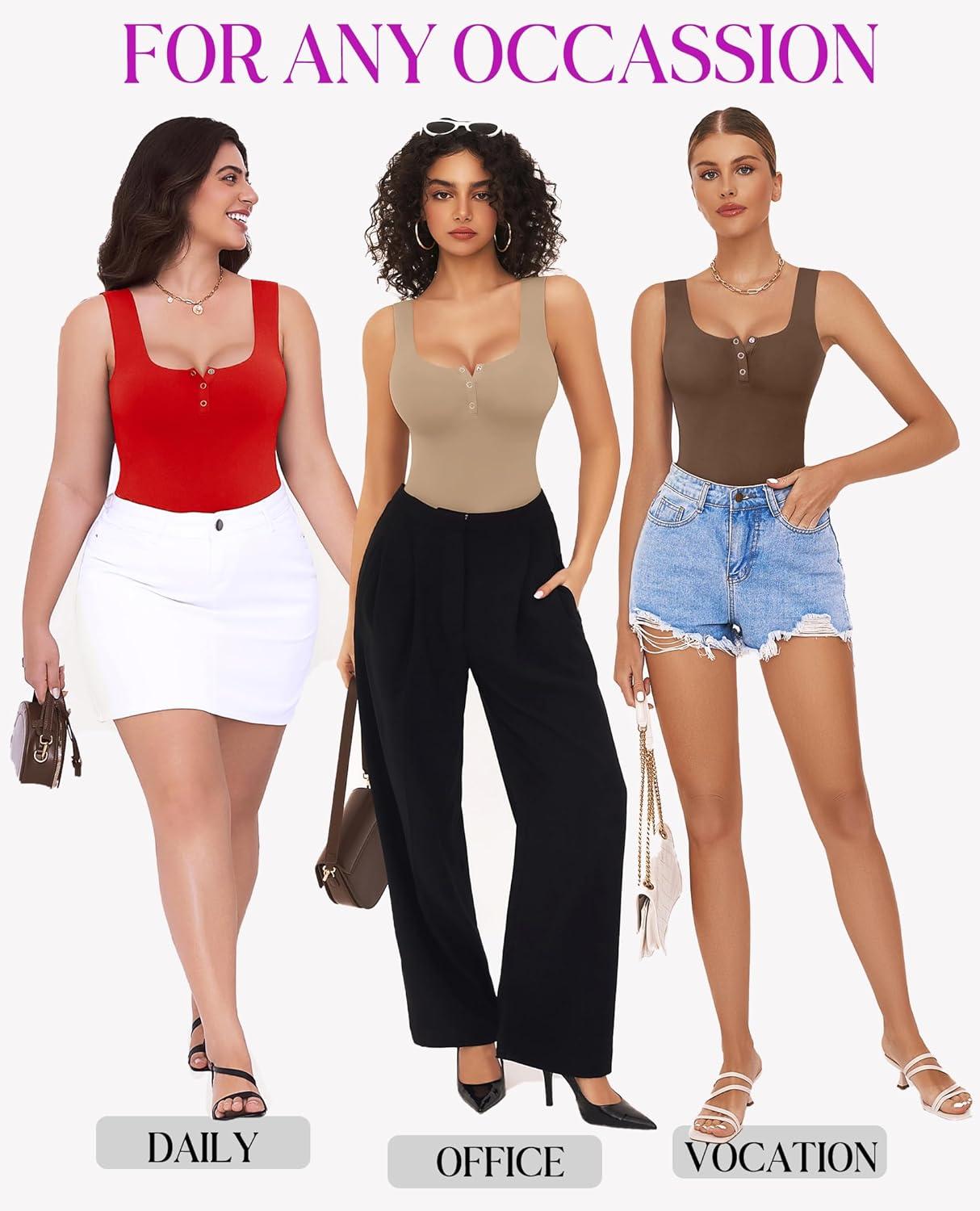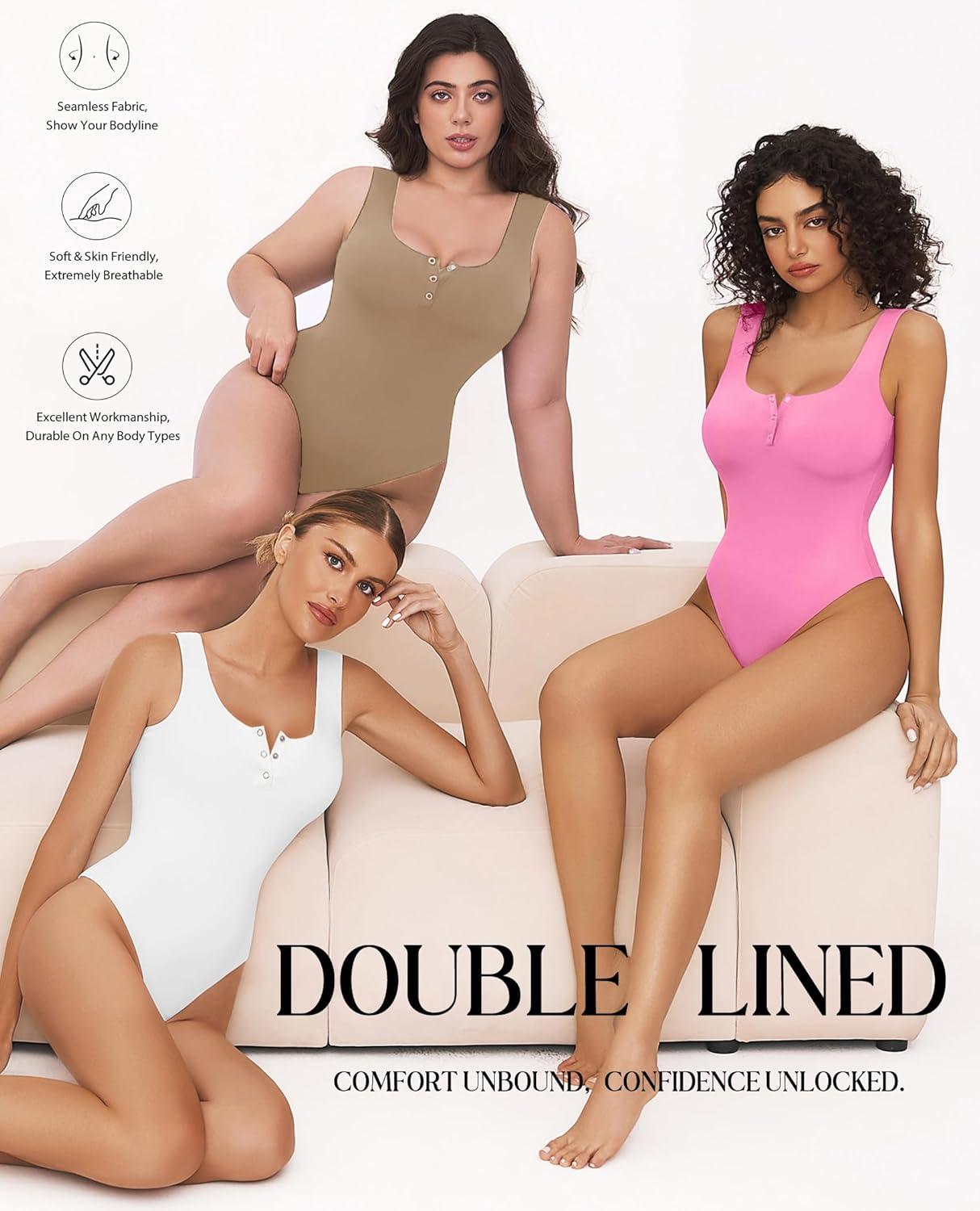 Avidlove Bodysuits for Women Button Down Square Neck Sleeveless Body Suit Snap Closure Double Lined Tank Tops Bodysuit(Pink)