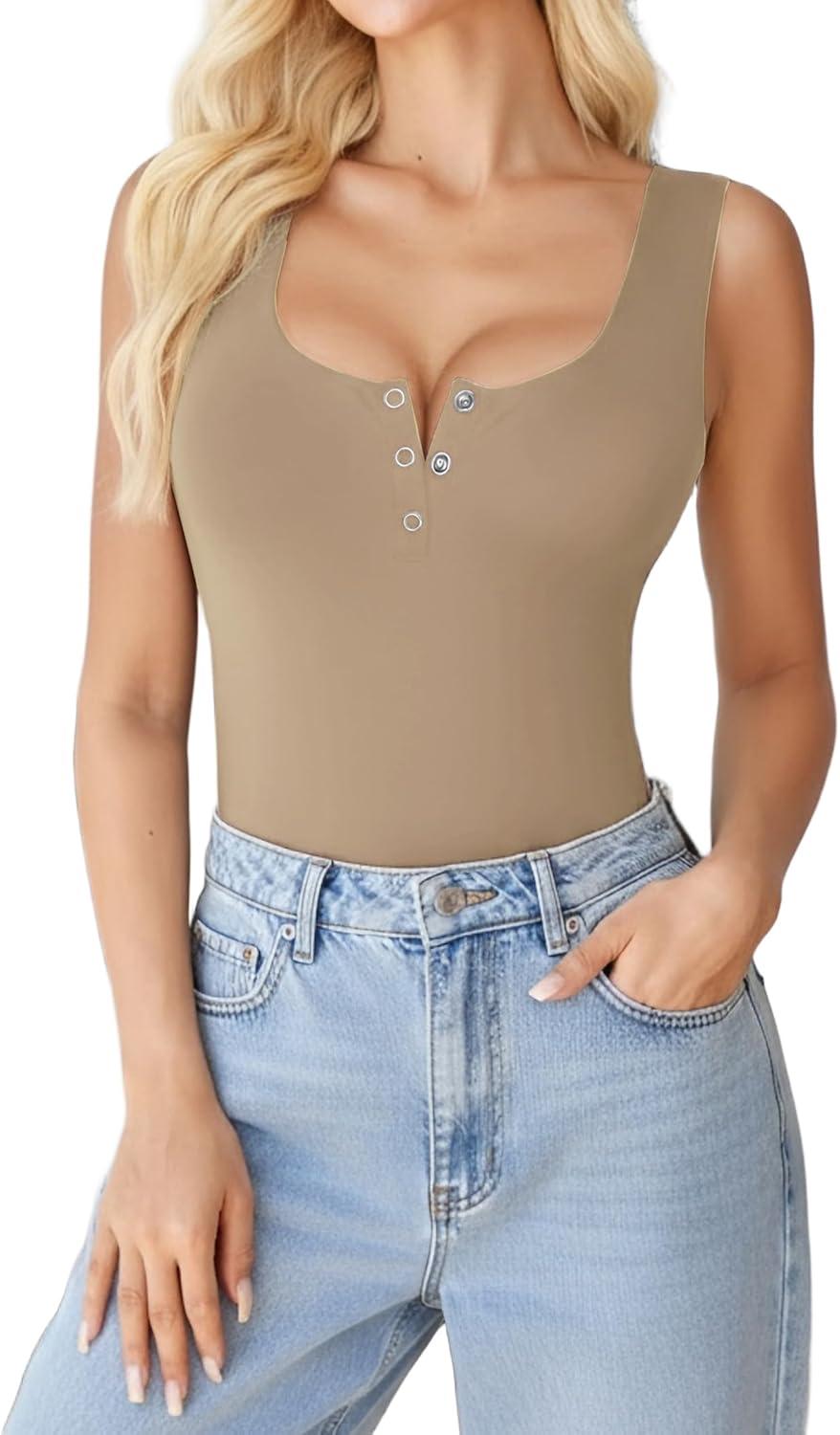 Avidlove Bodysuits for Women Button Down Square Neck Sleeveless Body Suit Snap Closure Double Lined Tank Tops Bodysuit(Khaki)