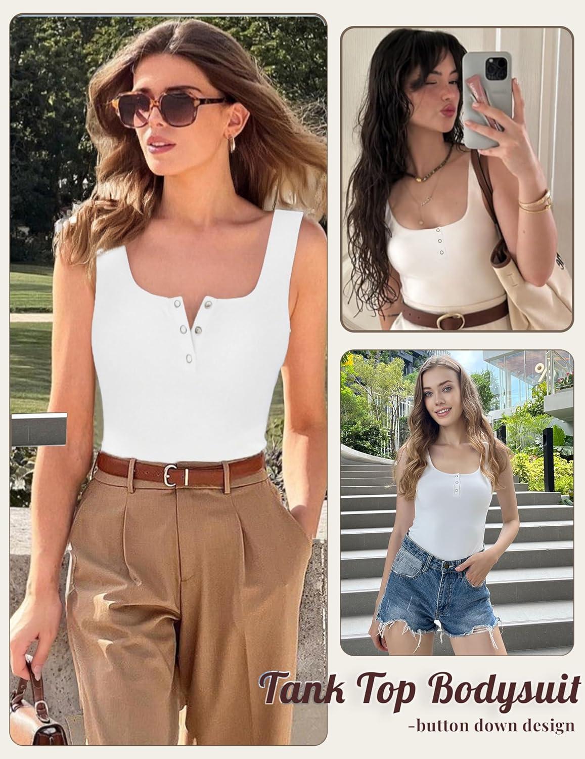 Avidlove Bodysuits for Women Button Down Square Neck Sleeveless Body Suit Snap Closure Double Lined Tank Tops Bodysuit(White)