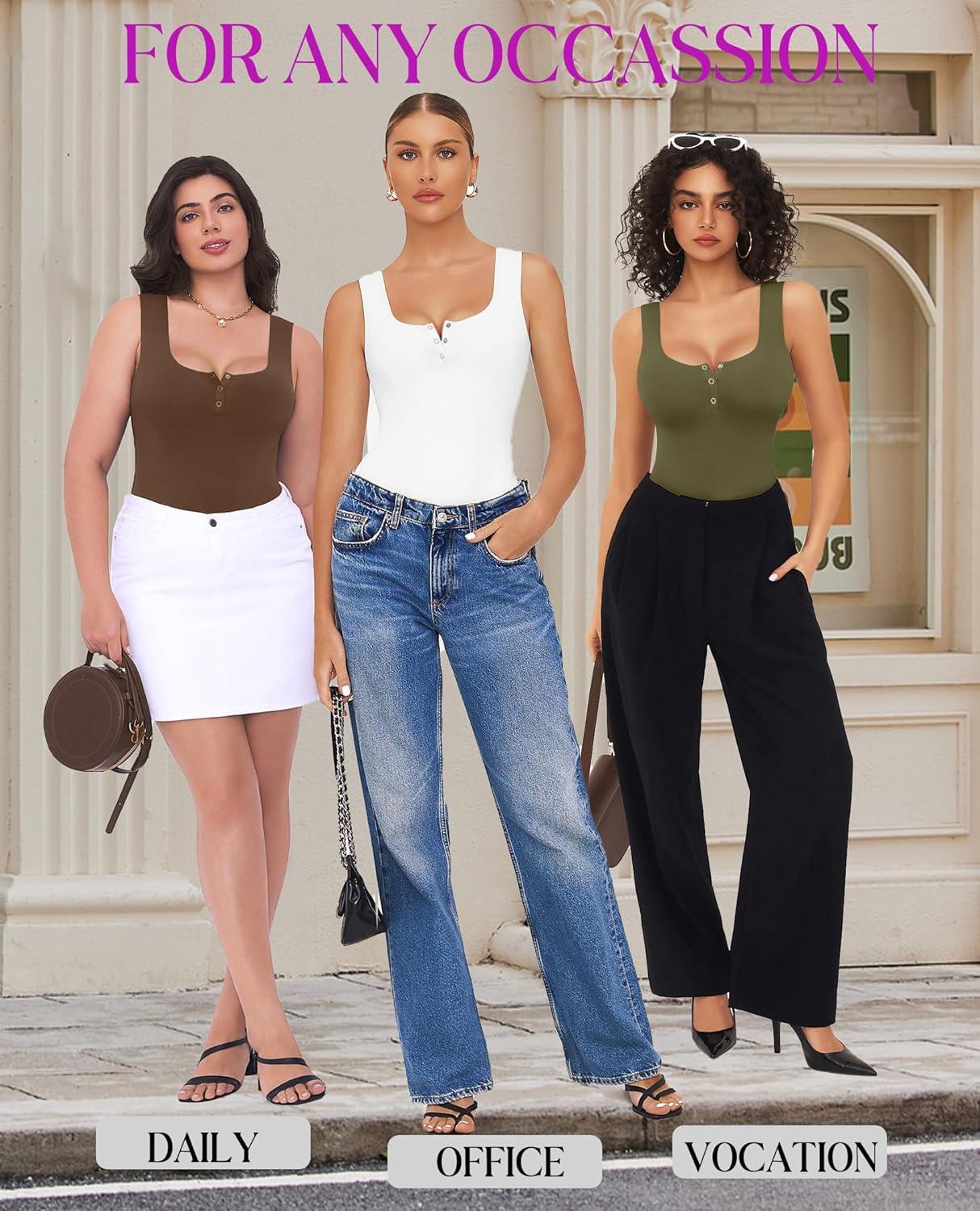 Avidlove Bodysuits for Women Button Down Square Neck Sleeveless Body Suit Snap Closure Double Lined Tank Tops Bodysuit(Army Green)