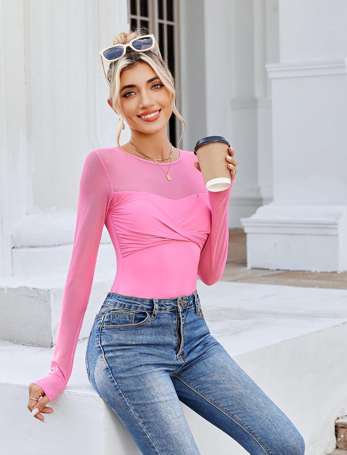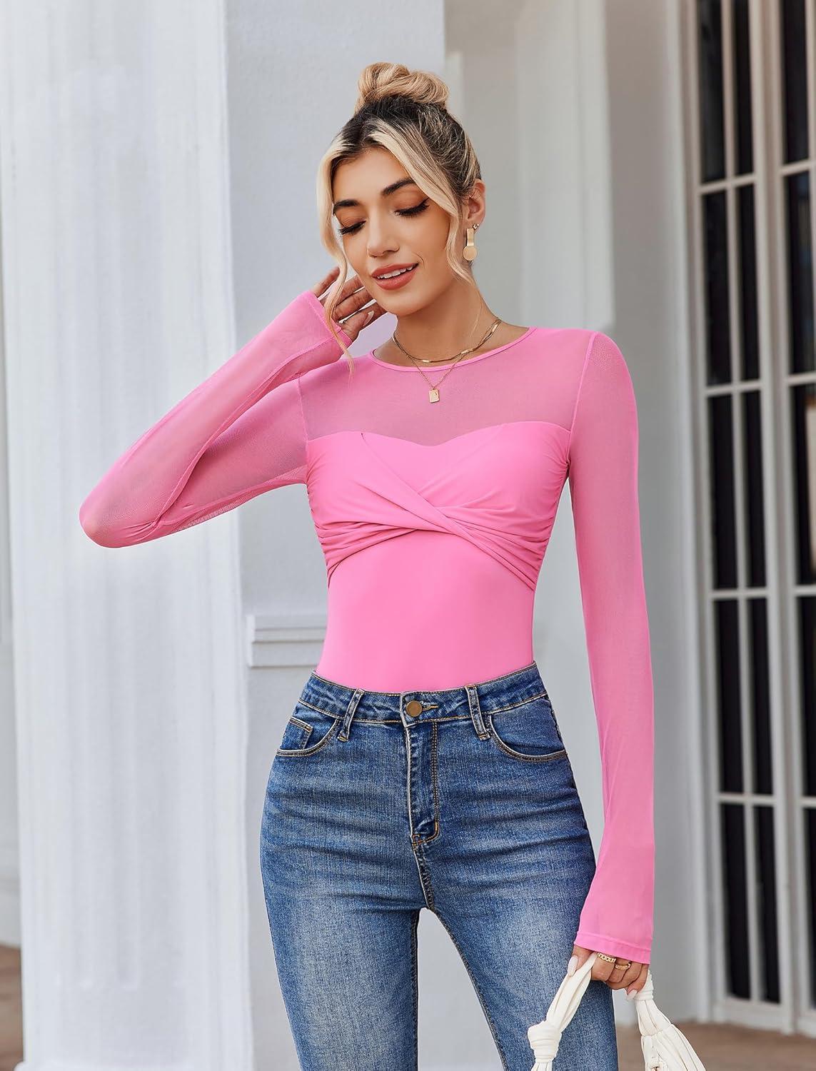 Avidlove Bodysuits for Women Long Sleeve Crew Neck Body Suit One Piece Sheer Leotard Twist Knot Going Out Tops(Hot Pink)