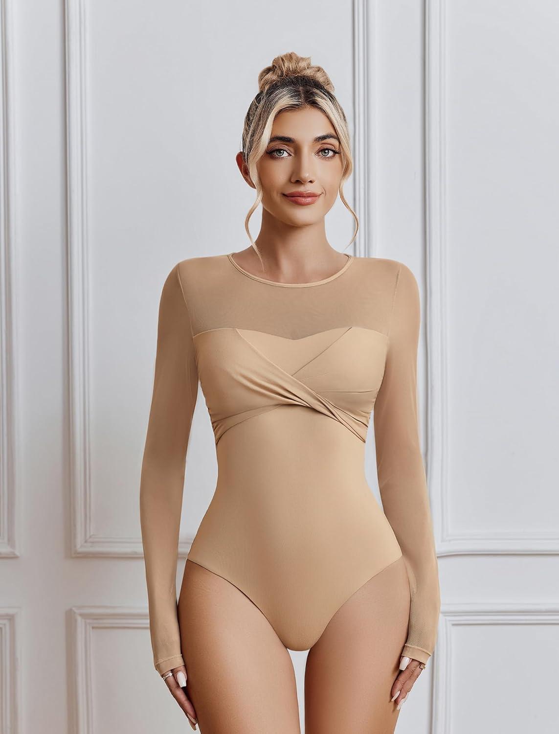 Avidlove Bodysuits for Women Long Sleeve Crew Neck Body Suit One Piece Sheer Leotard Twist Knot Going Out Tops(Nude)