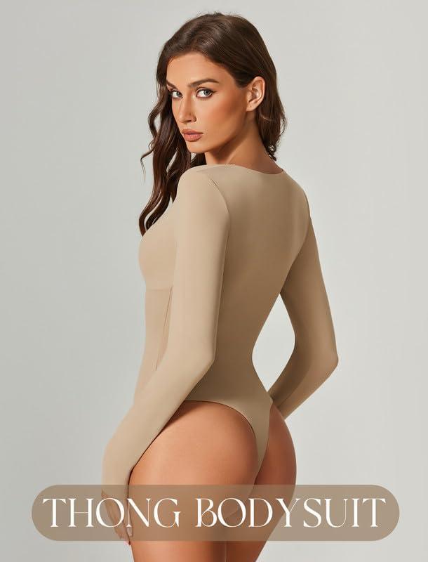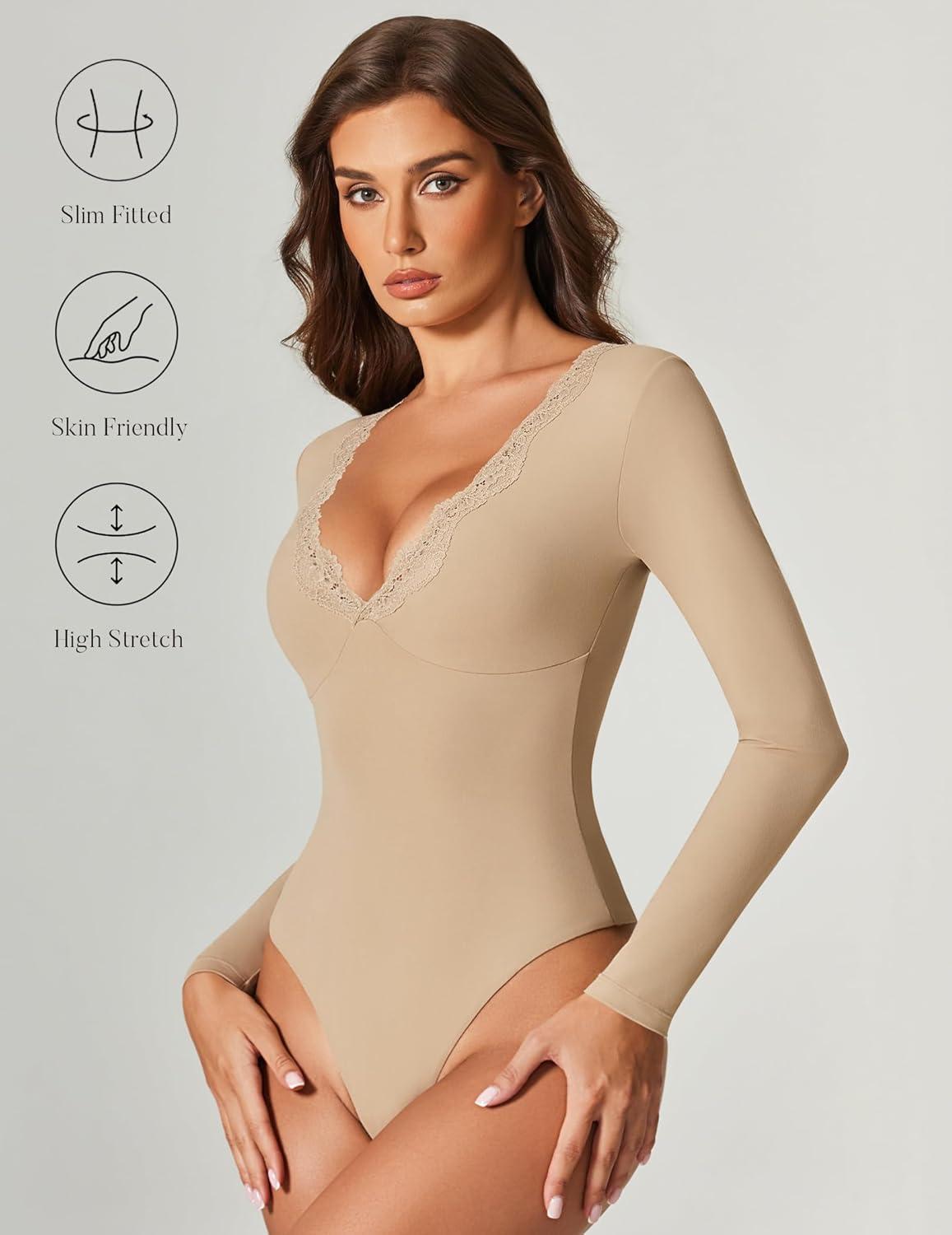 Avidlove Bodysuits for Women Long Sleeve Lace V Neck Body Suits Double Lined One Piece Leotard Shirt Going Out Tops(Nude)