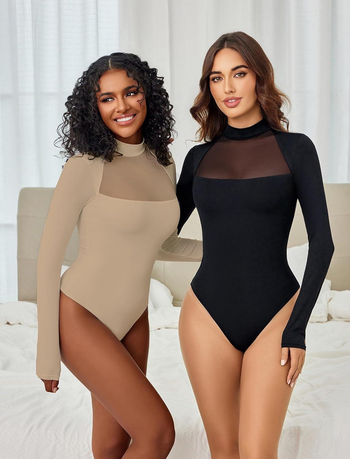Avidlove Bodysuits for Women Mock Neck Shapewear Body Suit Long Sleeve Leotard Mesh Going Out Tops Concert Outfits(Khaki)
