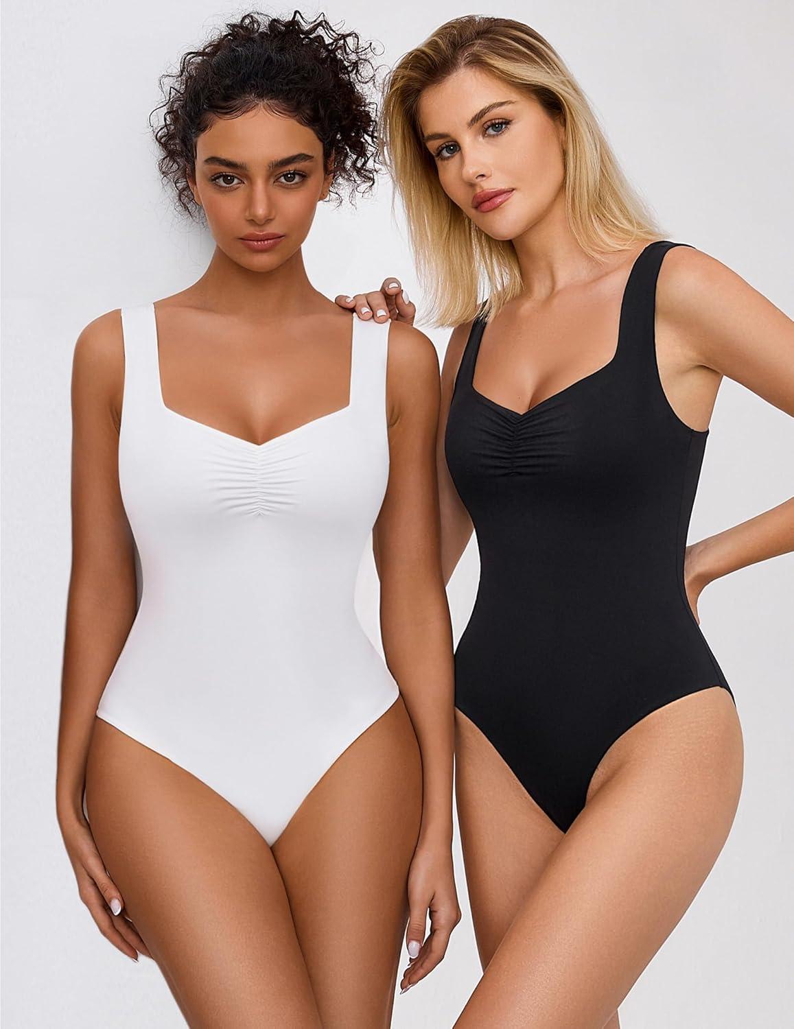 Avidlove Bodysuits for Women Sweetheart Neck Ruched Body Suit Seamless Double Lined Tank Top Slimming(Black)
