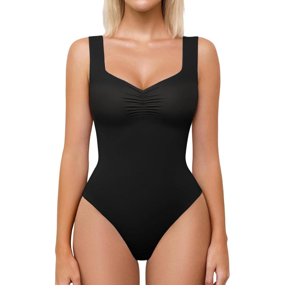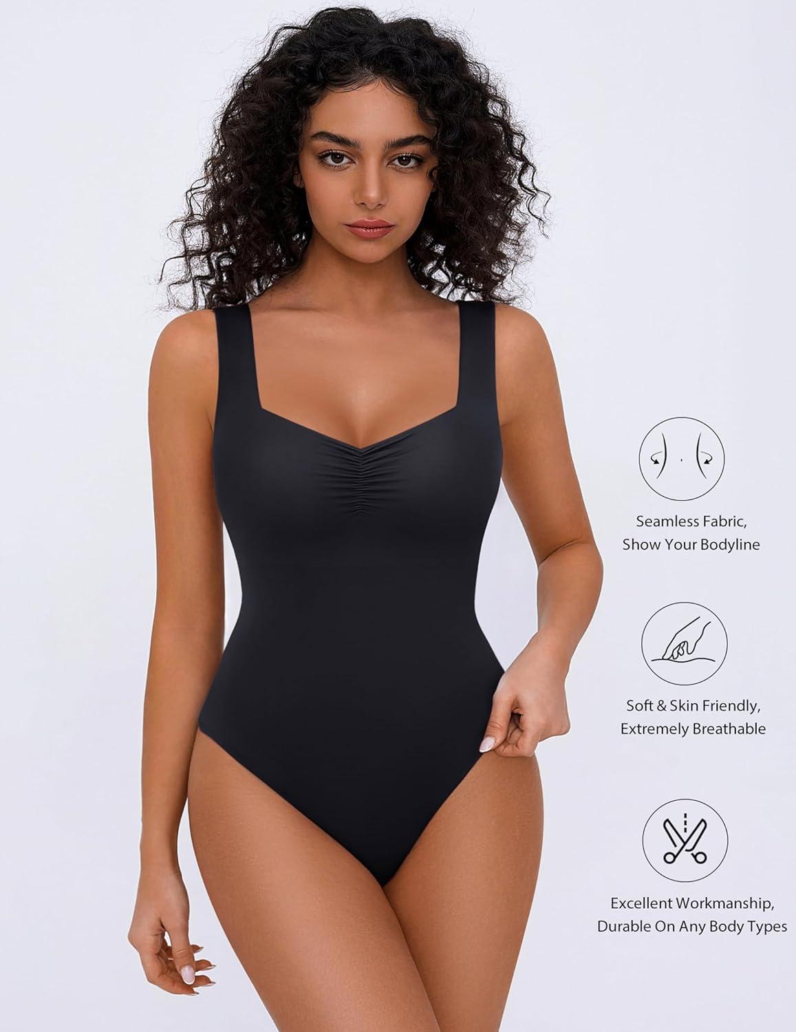 imageAvidlove Bodysuits for Women Sweetheart Neck Ruched Body Suit Seamless Double Lined Tank Top SlimmingBlack