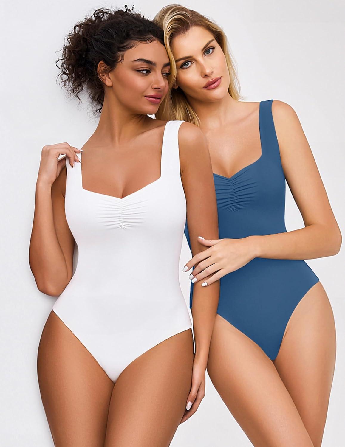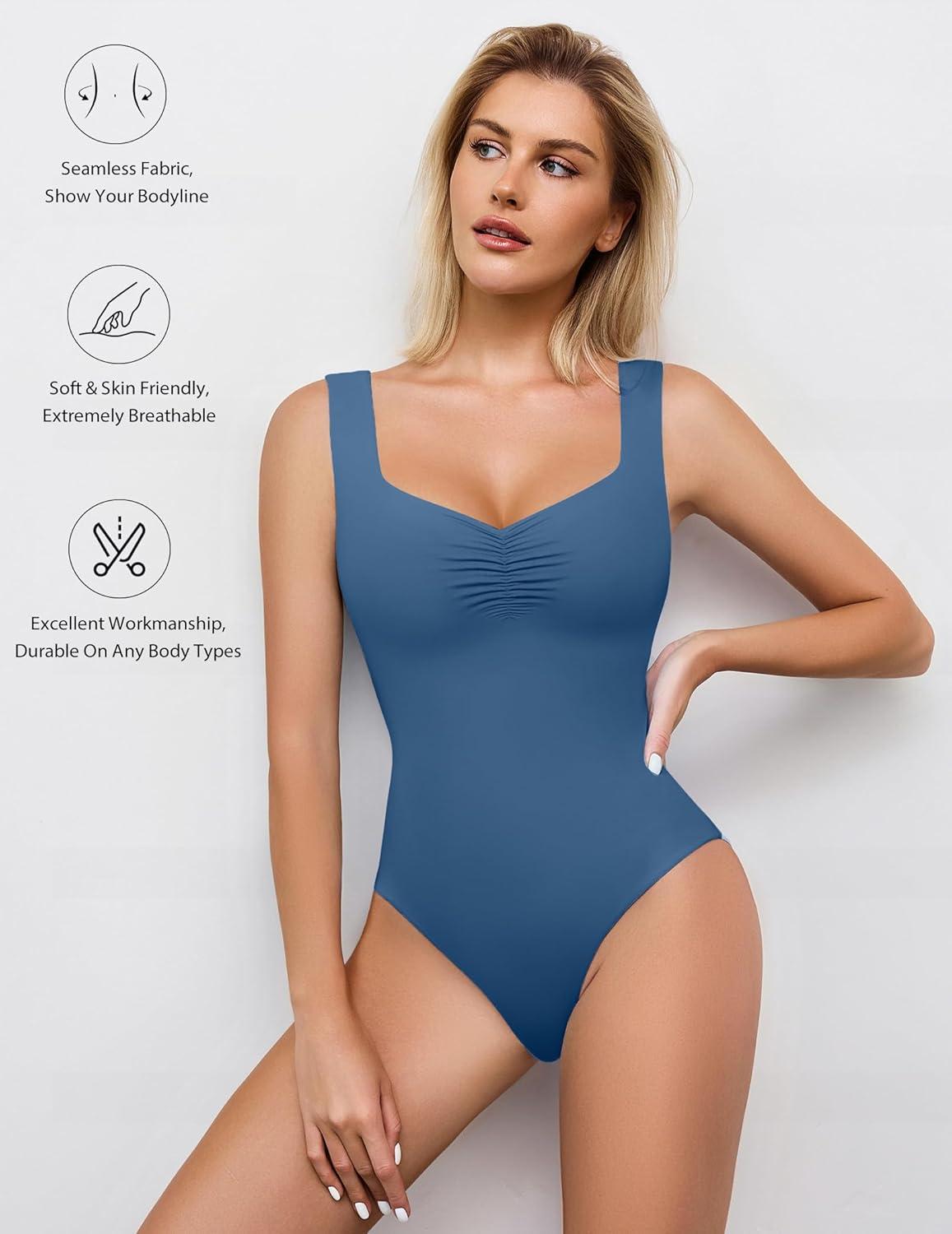 Avidlove Bodysuits for Women Sweetheart Neck Ruched Body Suit Seamless Double Lined Tank Top Slimming(Light Blue)