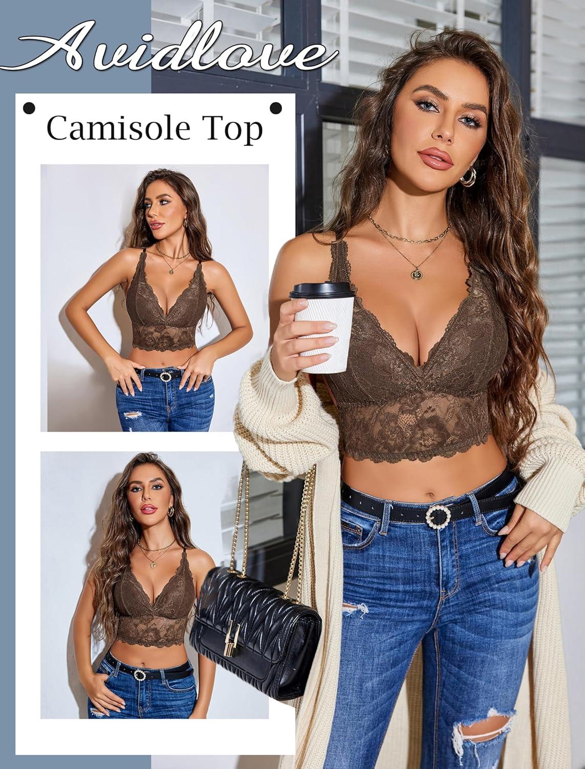 imageAvidlove Bralettes for Women Lace Wireless Bra V Neck Racerback Crop Top Adjustable Lingerie No PaddedBrown