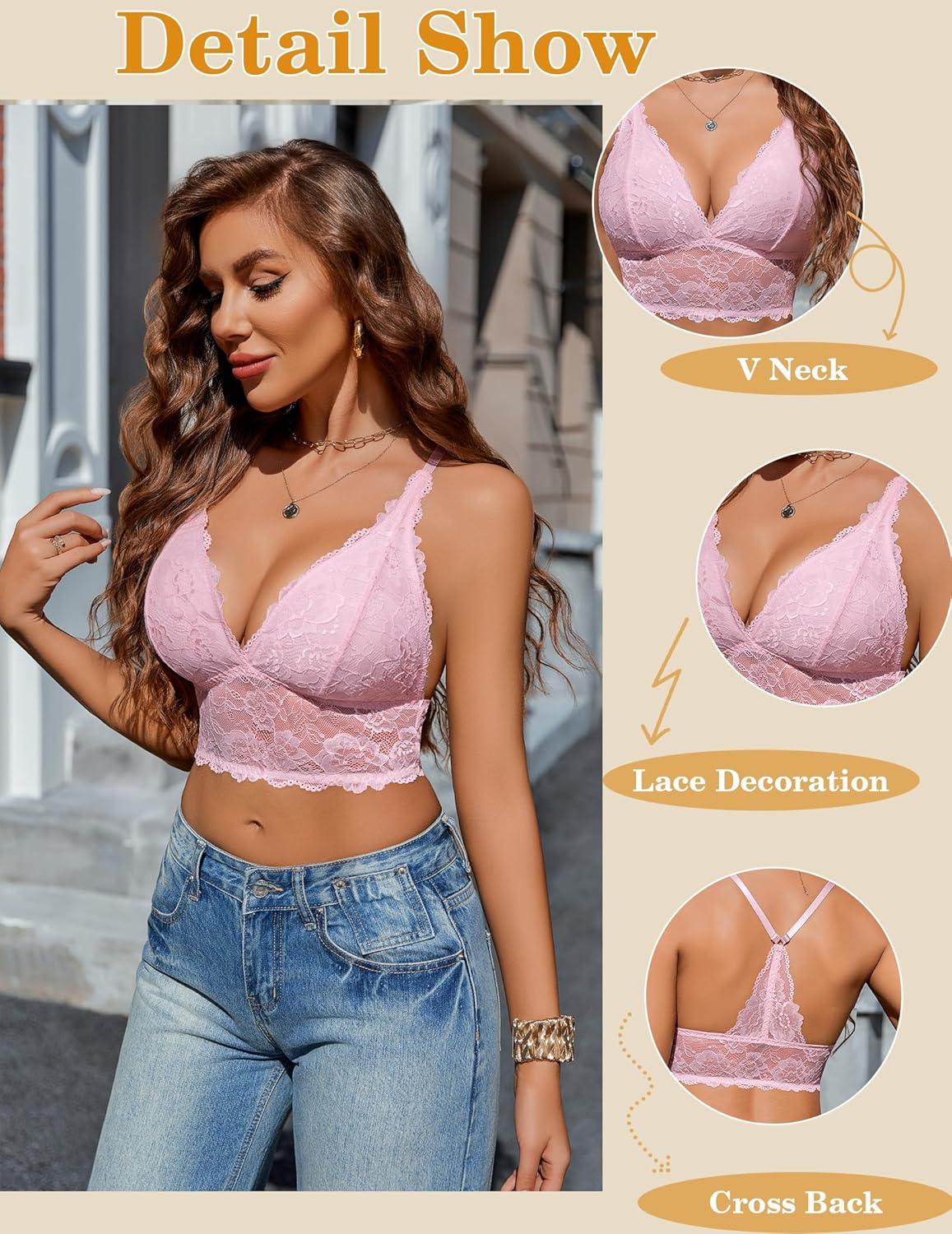 Avidlove Bralettes for Women Lace Wireless Bra V Neck Racerback Crop Top Adjustable Lingerie No Padded(Dark Pink)