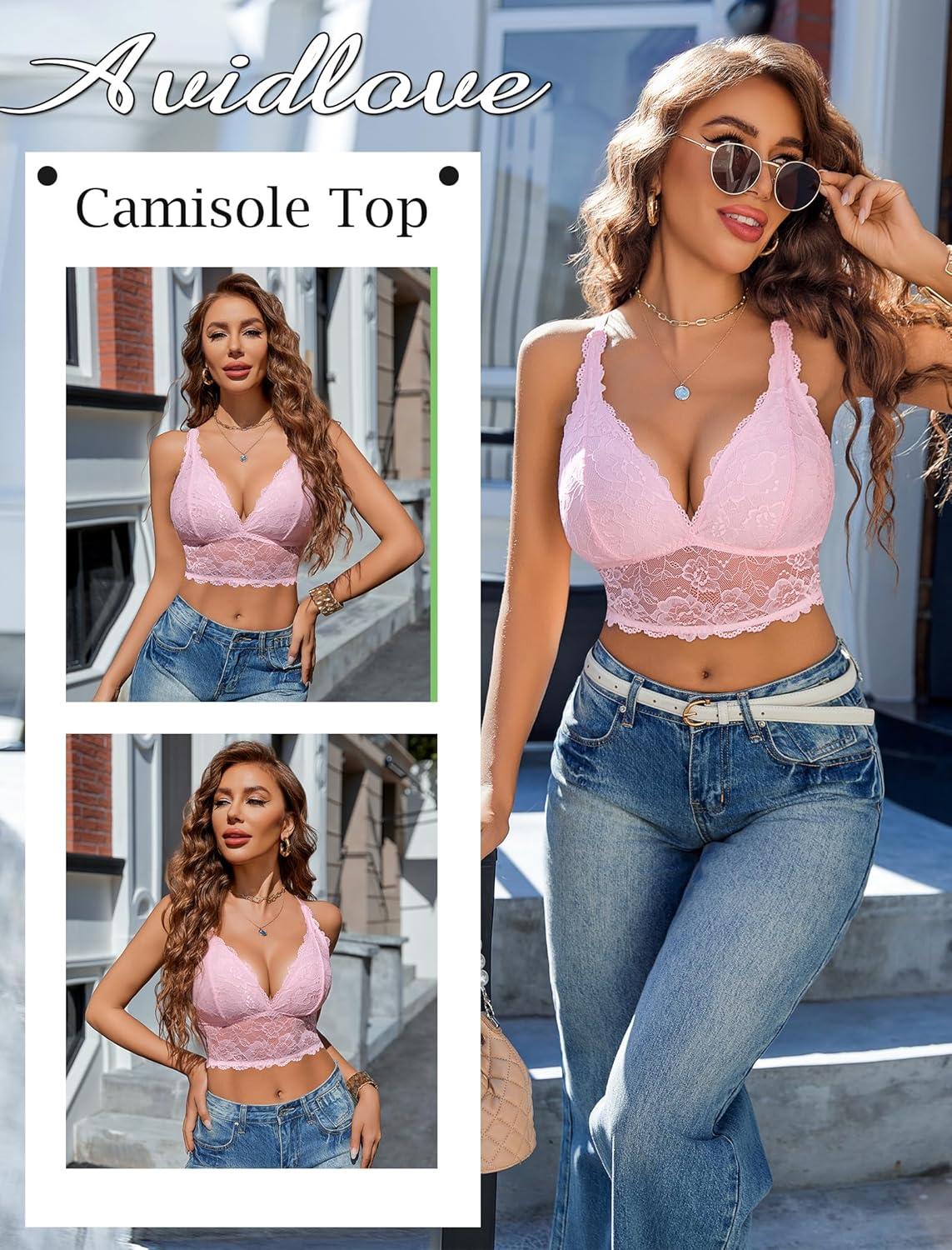 imageAvidlove Bralettes for Women Lace Wireless Bra V Neck Racerback Crop Top Adjustable Lingerie No PaddedDark Pink