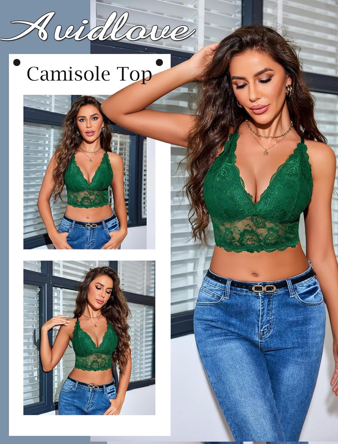 imageAvidlove Bralettes for Women Lace Wireless Bra V Neck Racerback Crop Top Adjustable Lingerie No PaddedGreen