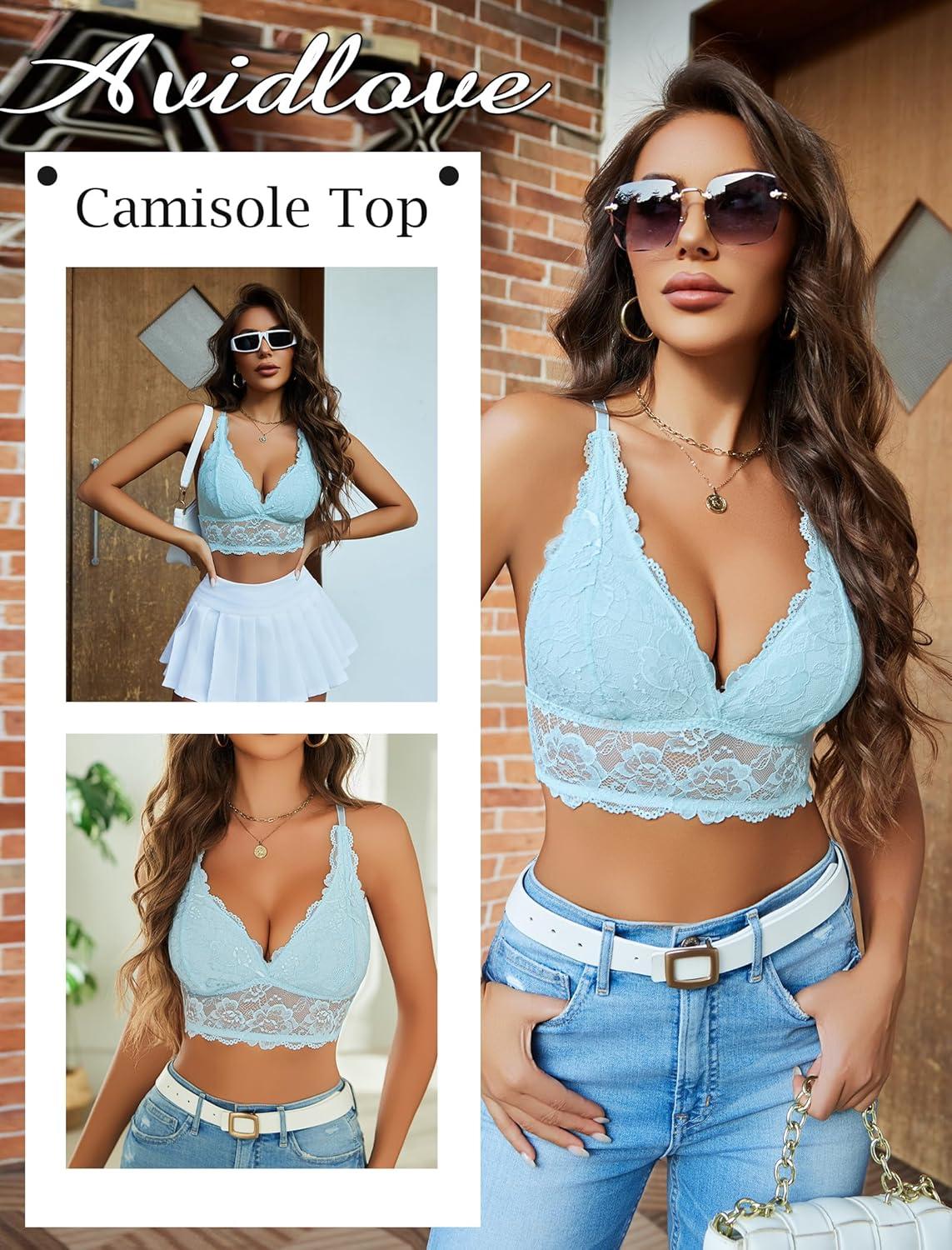 imageAvidlove Bralettes for Women Lace Wireless Bra V Neck Racerback Crop Top Adjustable Lingerie No PaddedBlue