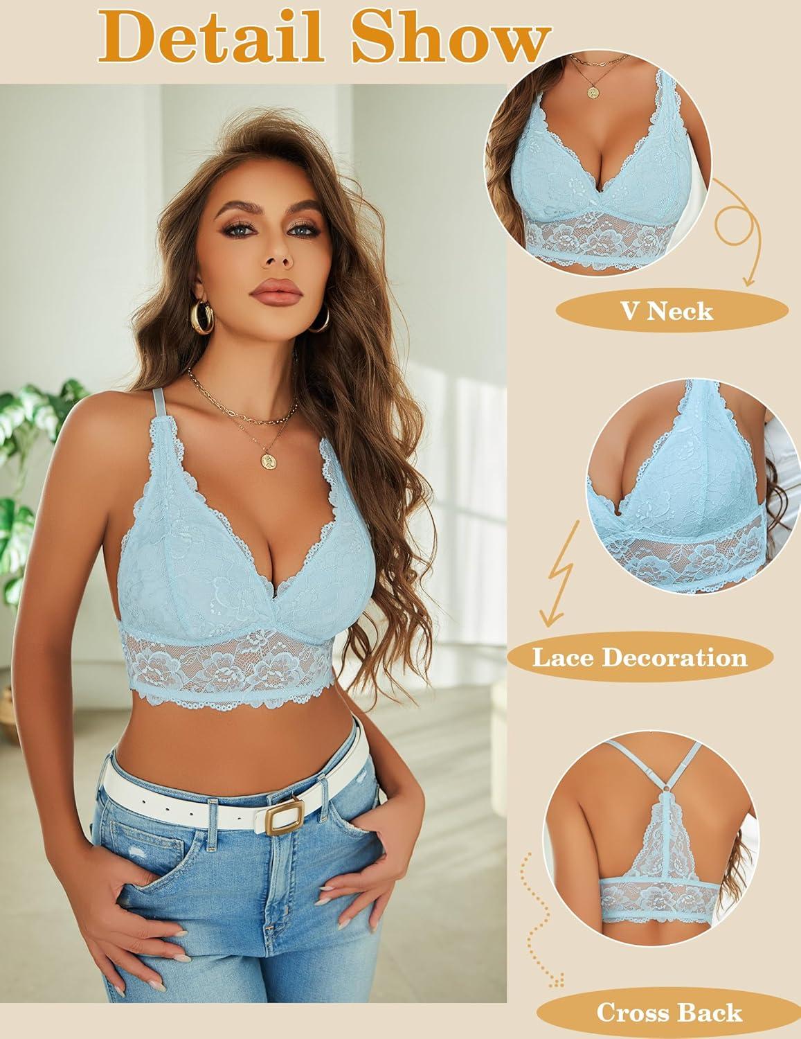 Avidlove Bralettes for Women Lace Wireless Bra V Neck Racerback Crop Top Adjustable Lingerie No Padded(Blue)