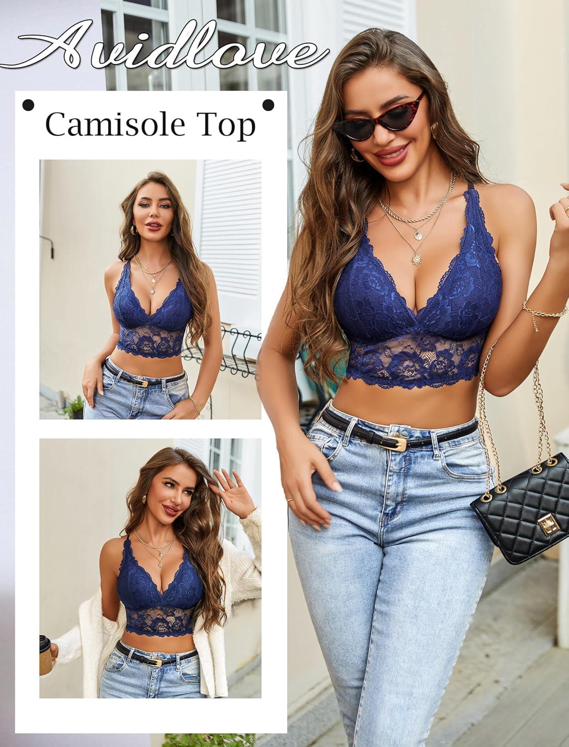 imageAvidlove Bralettes for Women Lace Wireless Bra V Neck Racerback Crop Top Adjustable Lingerie No PaddedNavy Blue