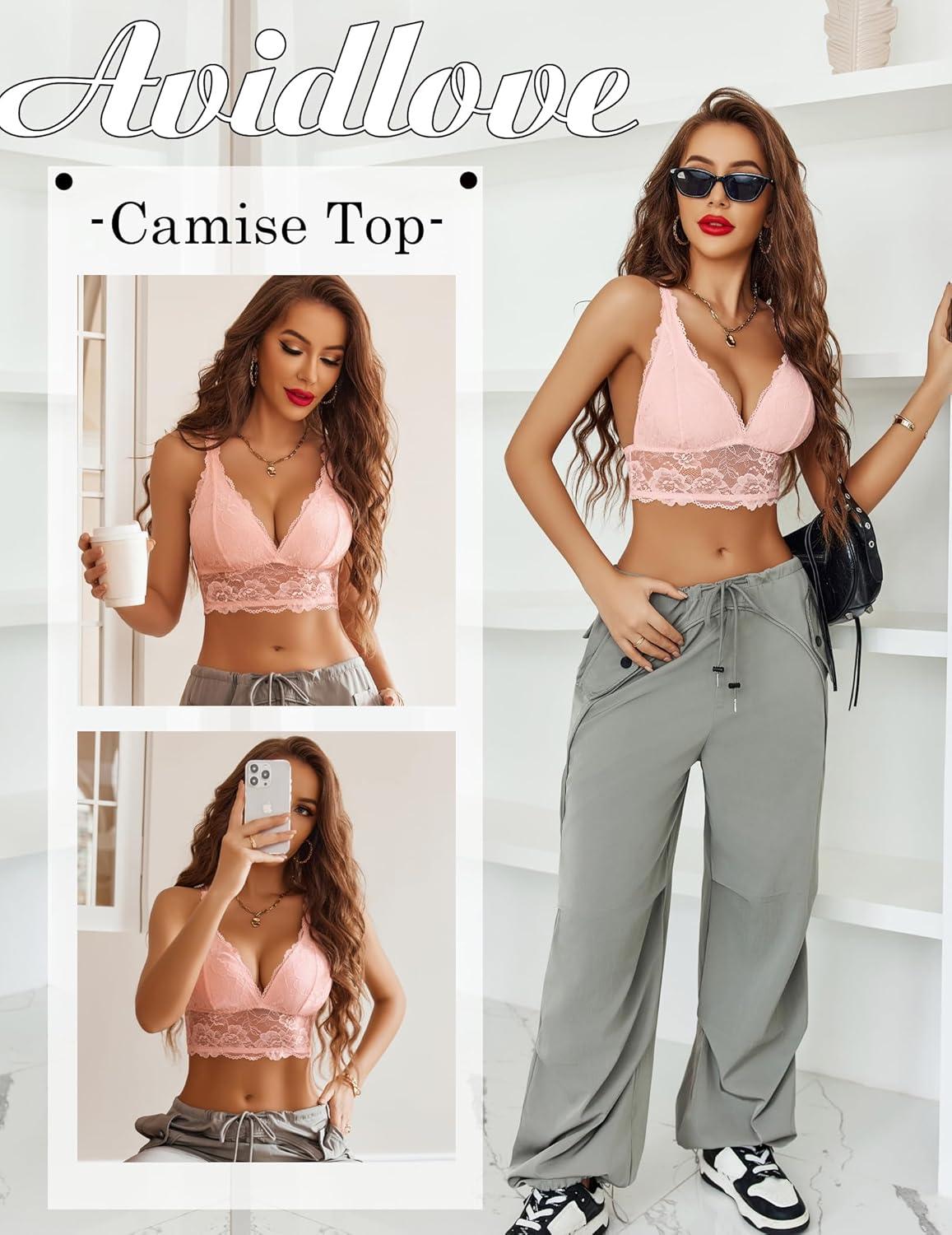 imageAvidlove Bralettes for Women Lace Wireless Bra V Neck Racerback Crop Top Adjustable Lingerie No PaddedPink