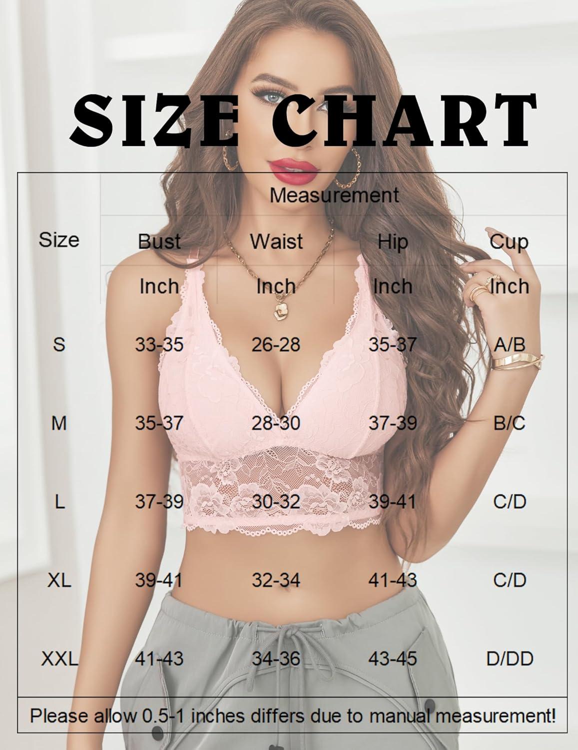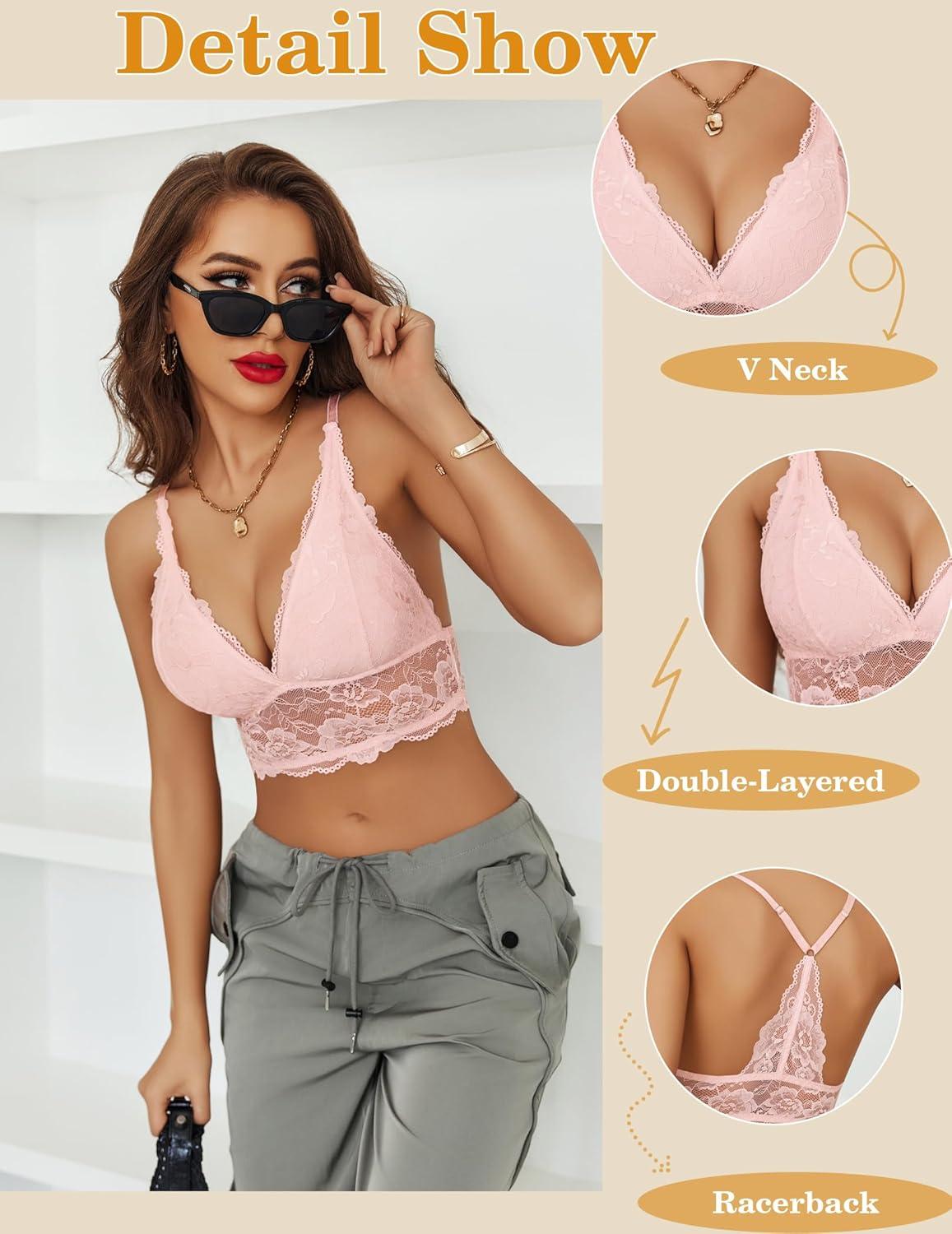 Avidlove Bralettes for Women Lace Wireless Bra V Neck Racerback Crop Top Adjustable Lingerie No Padded(Pink)