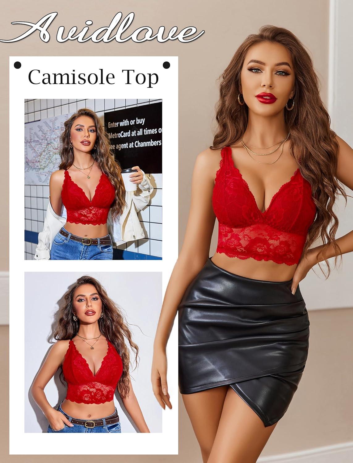 imageAvidlove Bralettes for Women Lace Wireless Bra V Neck Racerback Crop Top Adjustable Lingerie No PaddedRed