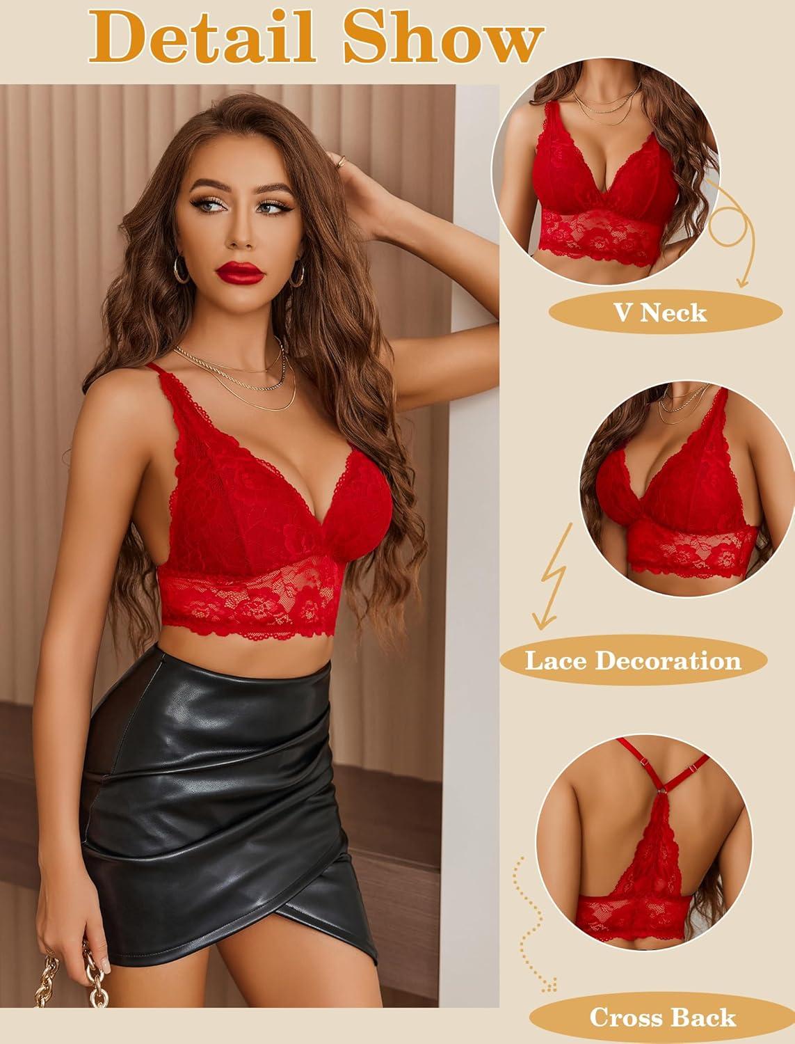 Avidlove Bralettes for Women Lace Wireless Bra V Neck Racerback Crop Top Adjustable Lingerie No Padded(Red)