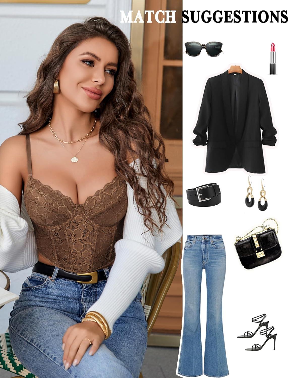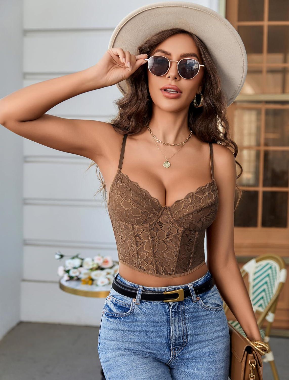 imageAvidlove Lace Bralette for Women V Neck Bustier Corset Tops with Underwired Racerback Adjustable Strap Crop TopBrown