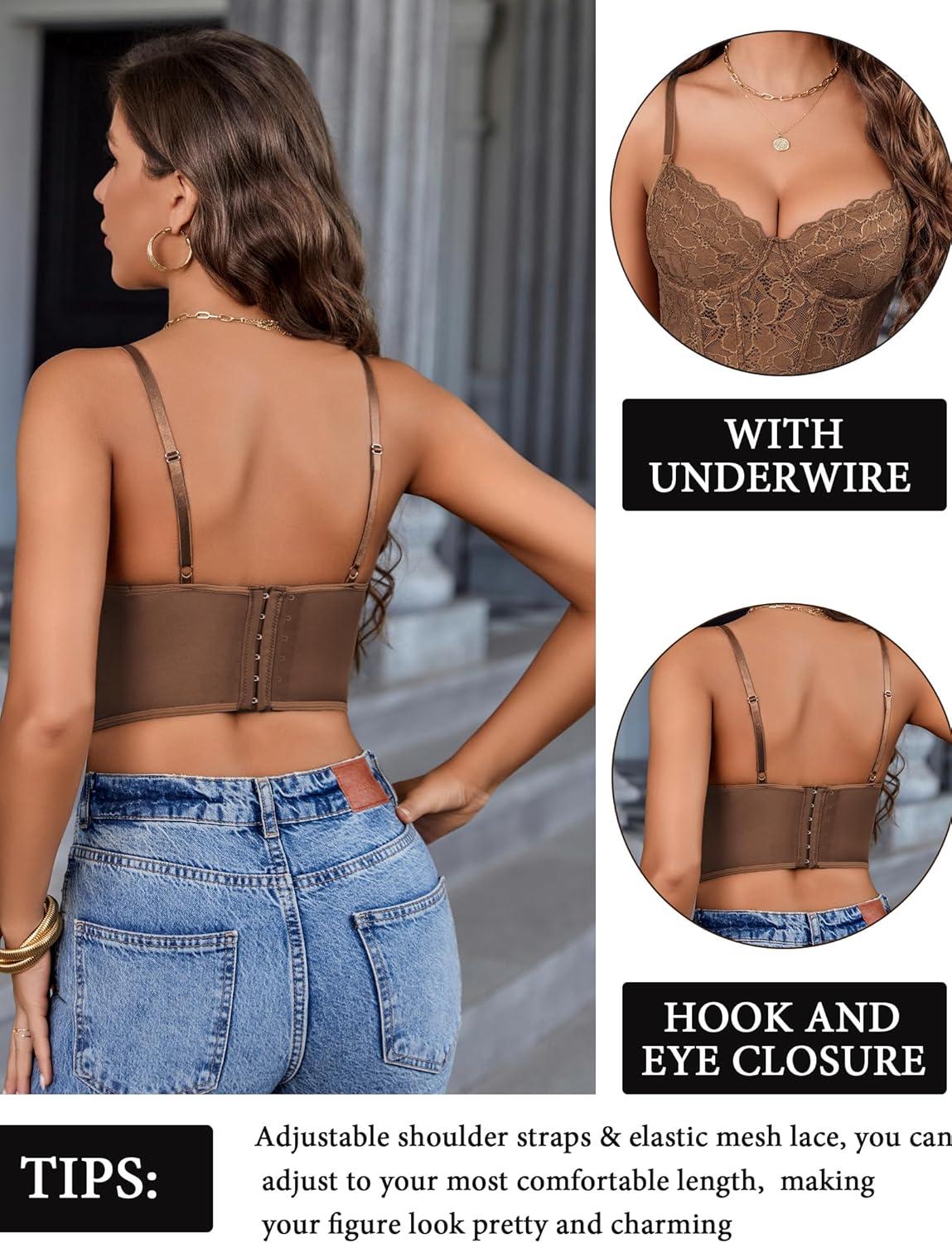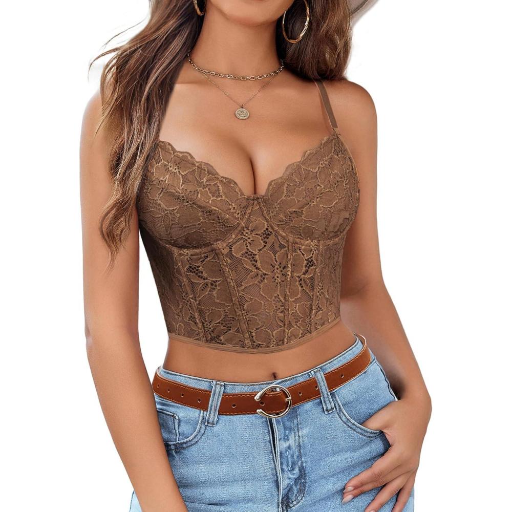 Avidlove Lace Bralette for Women V Neck Bustier Corset Tops with Underwired Racerback Adjustable Strap Crop Top(Brown)