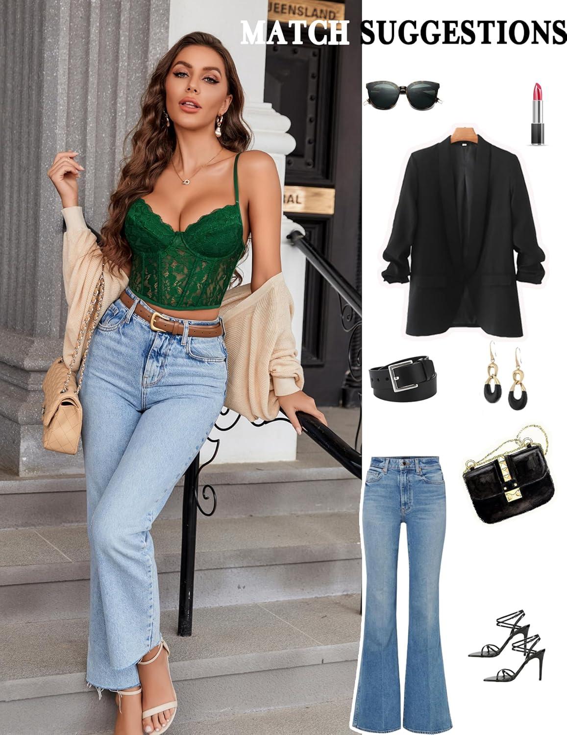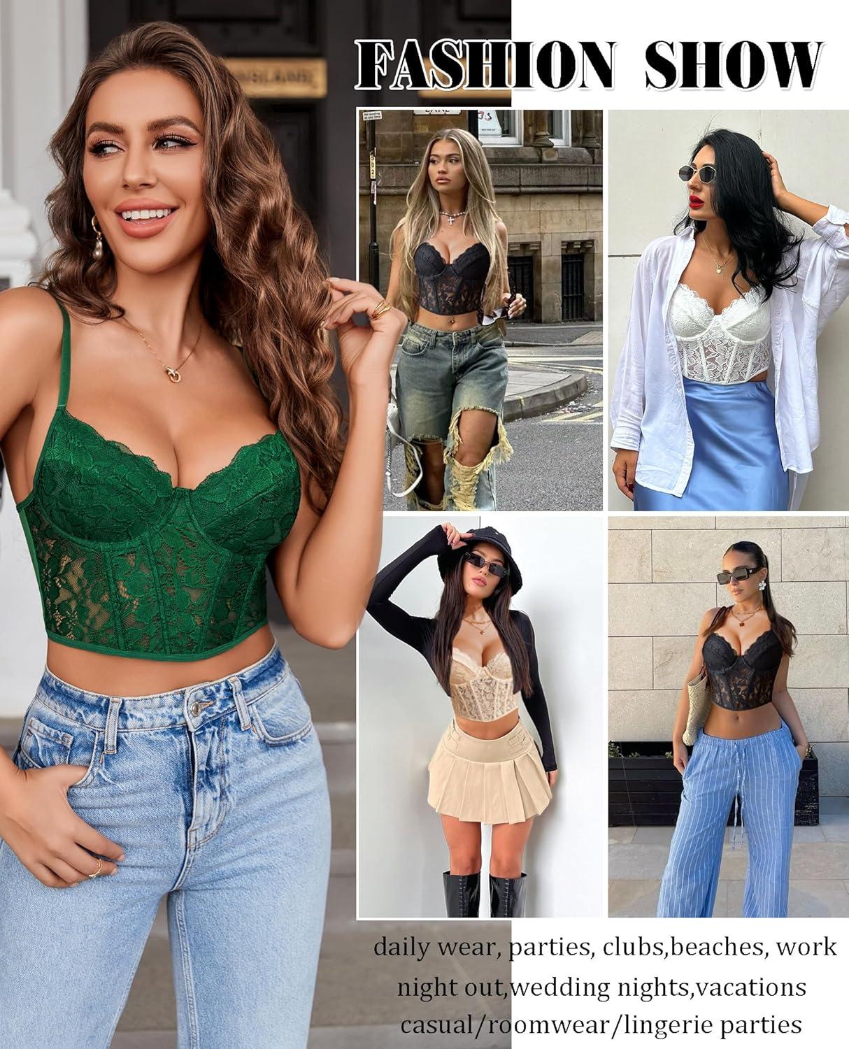 Avidlove Lace Bralette for Women V Neck Bustier Corset Tops with Underwired Racerback Adjustable Strap Crop Top(Grass Green)