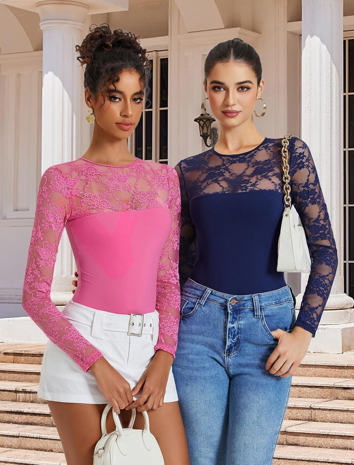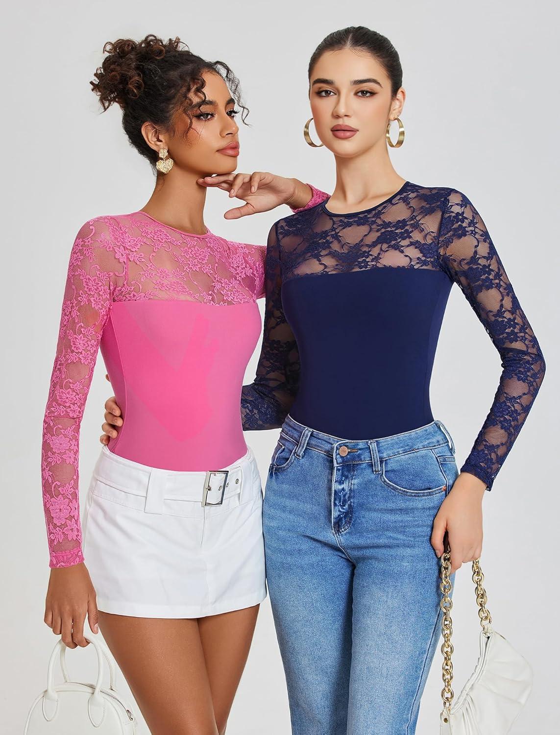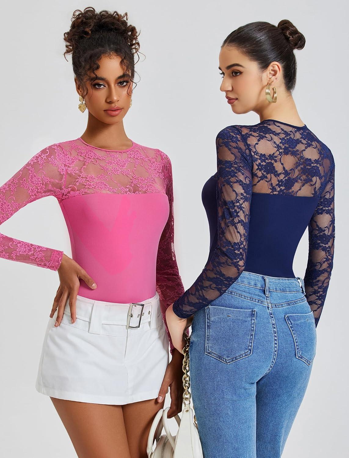 imageAvidlove Lace Long Sleeve Bodysuit for Women Crew Neck Body Suits Slimming Going Out Concert Tops Fall OutfitsNave Blue
