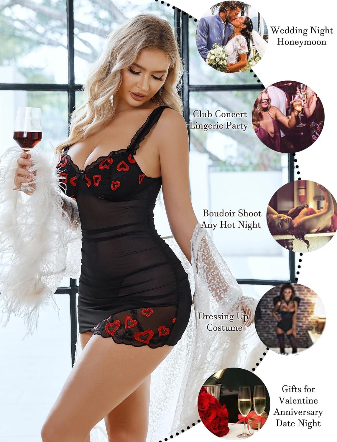 Avidlove Lingerie for Women Mesh Babydoll Lingeries Lace Chemise Floral Sleepwear Dress Sheer Exotic Boudoir Outfit S-XXL(Red Heart)