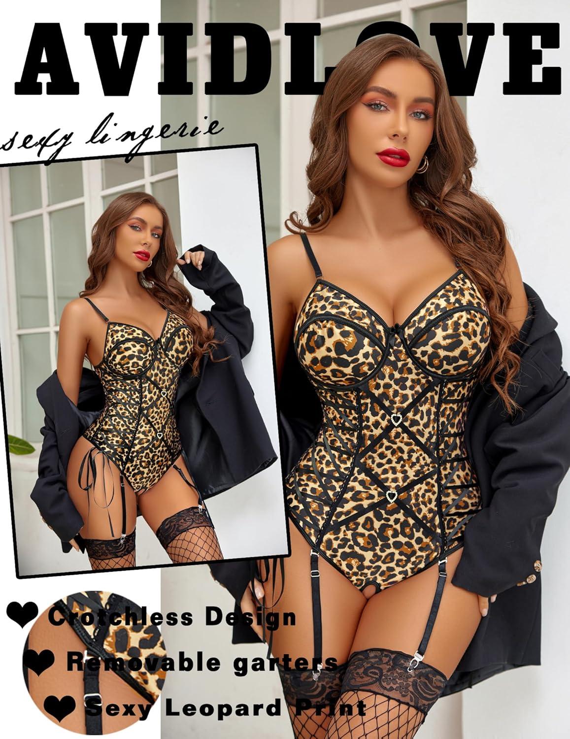 imageAvidlove Lingerie for Women Sexy Corset Garter Lingerie Set One Piece Teddy Bodysuit Boudoir OutfitAleopard