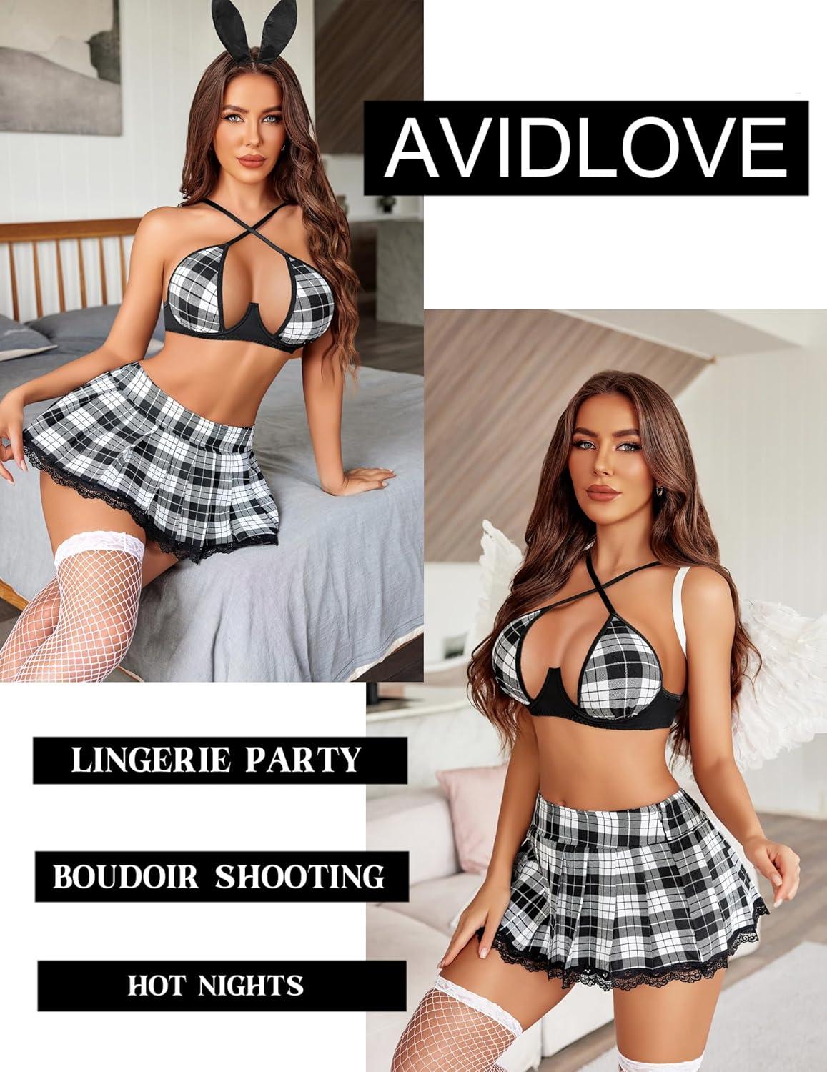 Avidlove Lingerie Set for Women with Underwire Two Piece Lingerie Sets Sexy Outfit Lingerie Set with Lace Mini Pleated Skirt(Black White Plaid)