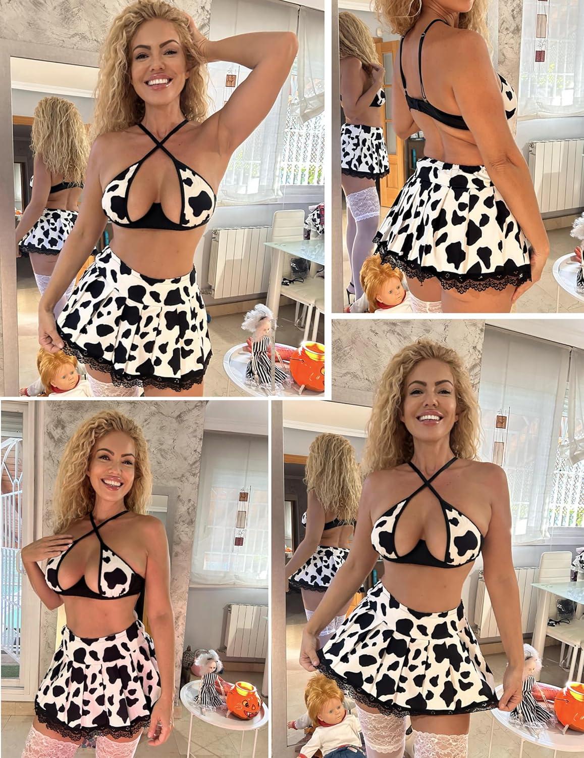 imageAvidlove Lingerie Set for Women with Underwire Two Piece Lingerie Sets Sexy Outfit Lingerie Set with Lace Mini Pleated SkirtCow Print