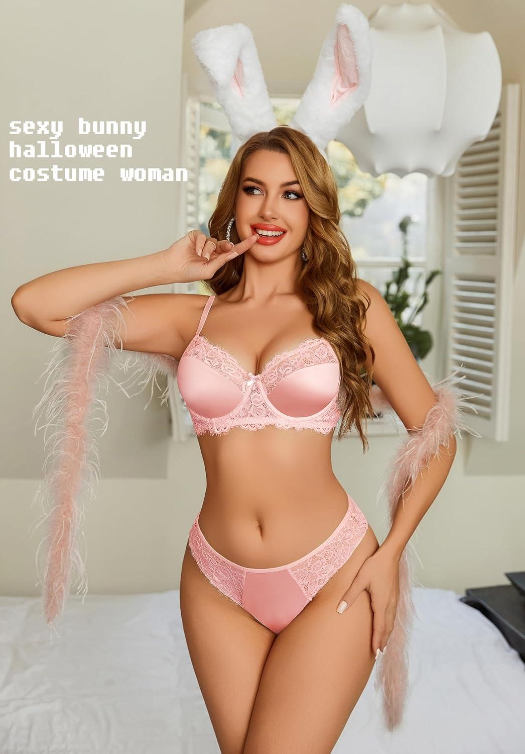 Avidlove Lingerie Sets for Women Sexy Underwire Bra and Pany Set Floral Lace 2 Pieces Underwear Satin Lingerie Outfit(Pink)