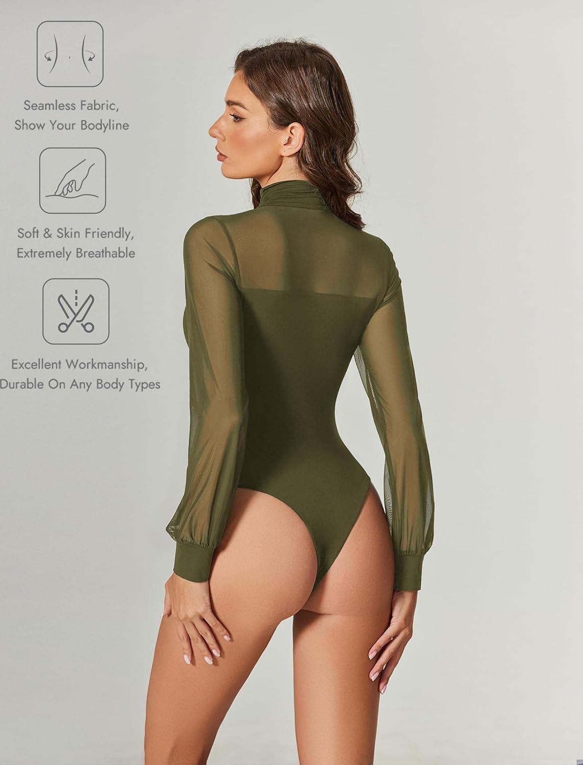 Avidlove Long Sleeve Body Suits Womens Mesh Turtleneck Bodysuit Thong Dressy Going Out Bodysuits Top Fall Outfits(Army Green)