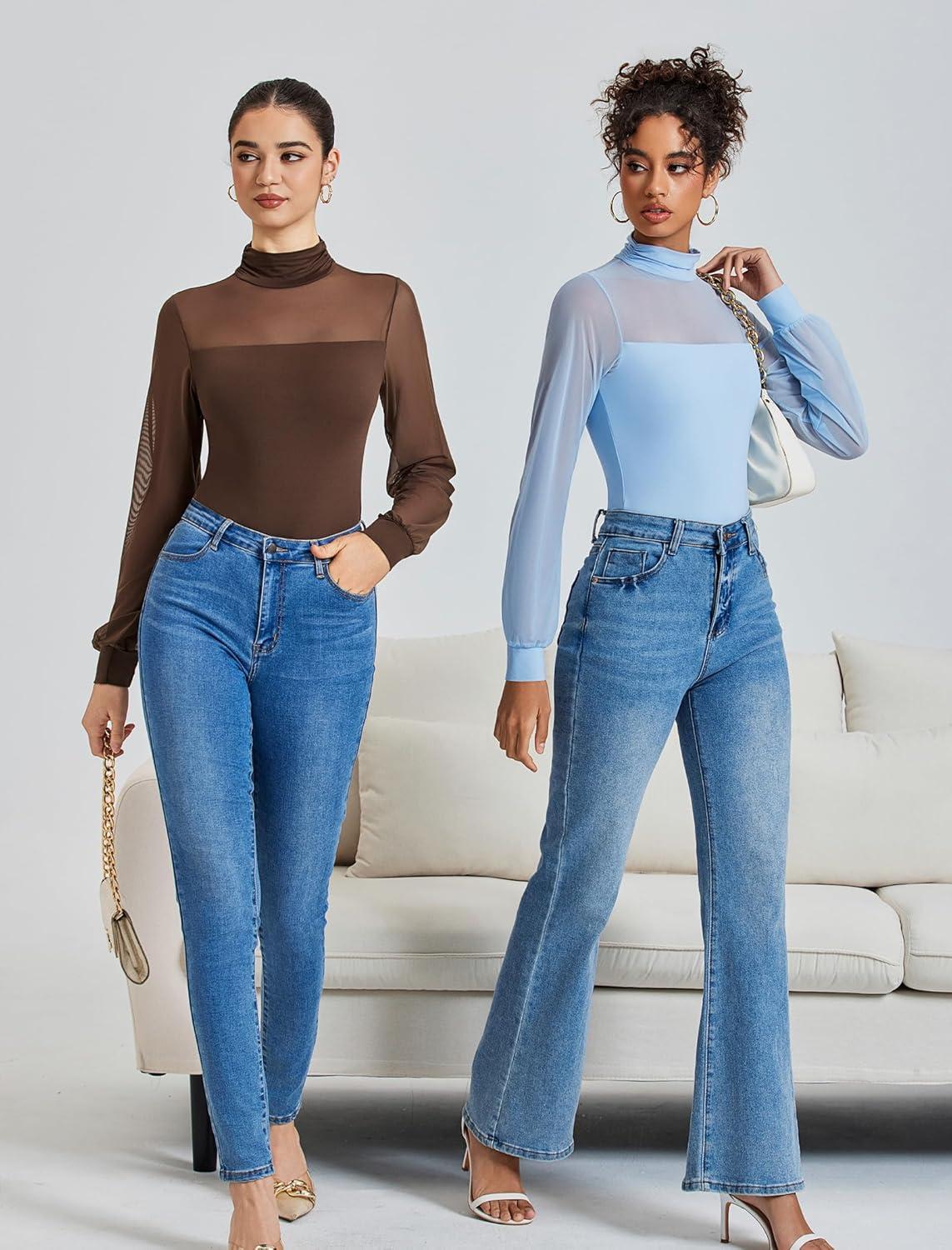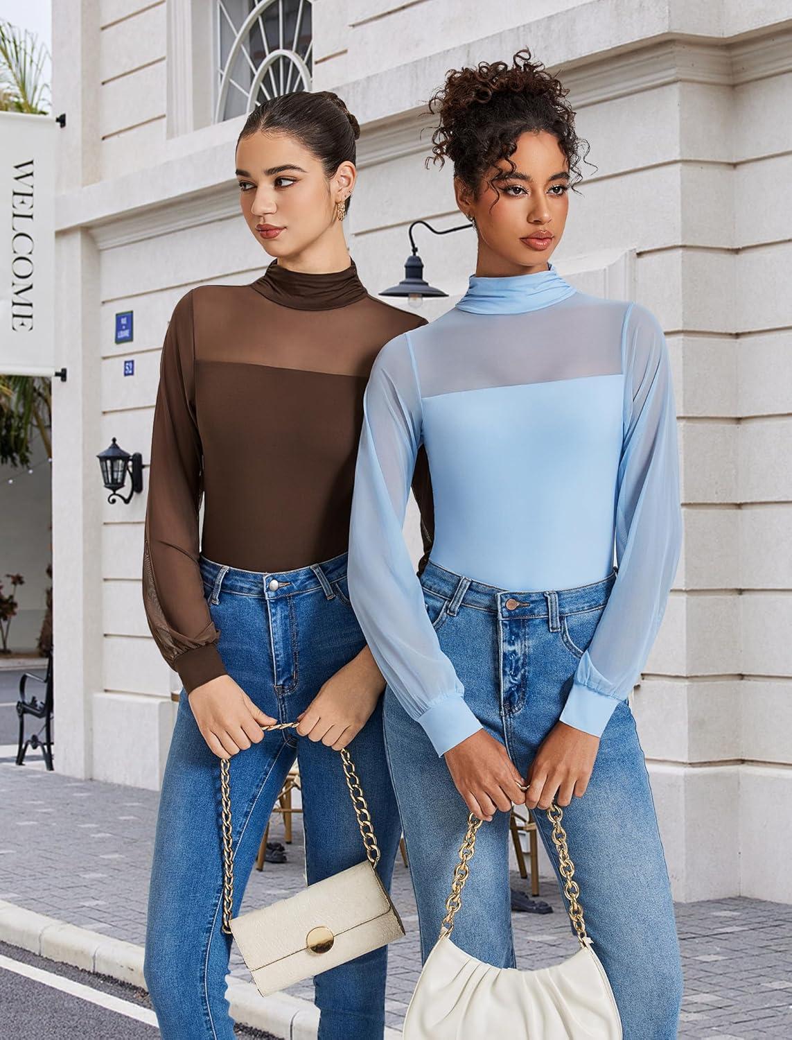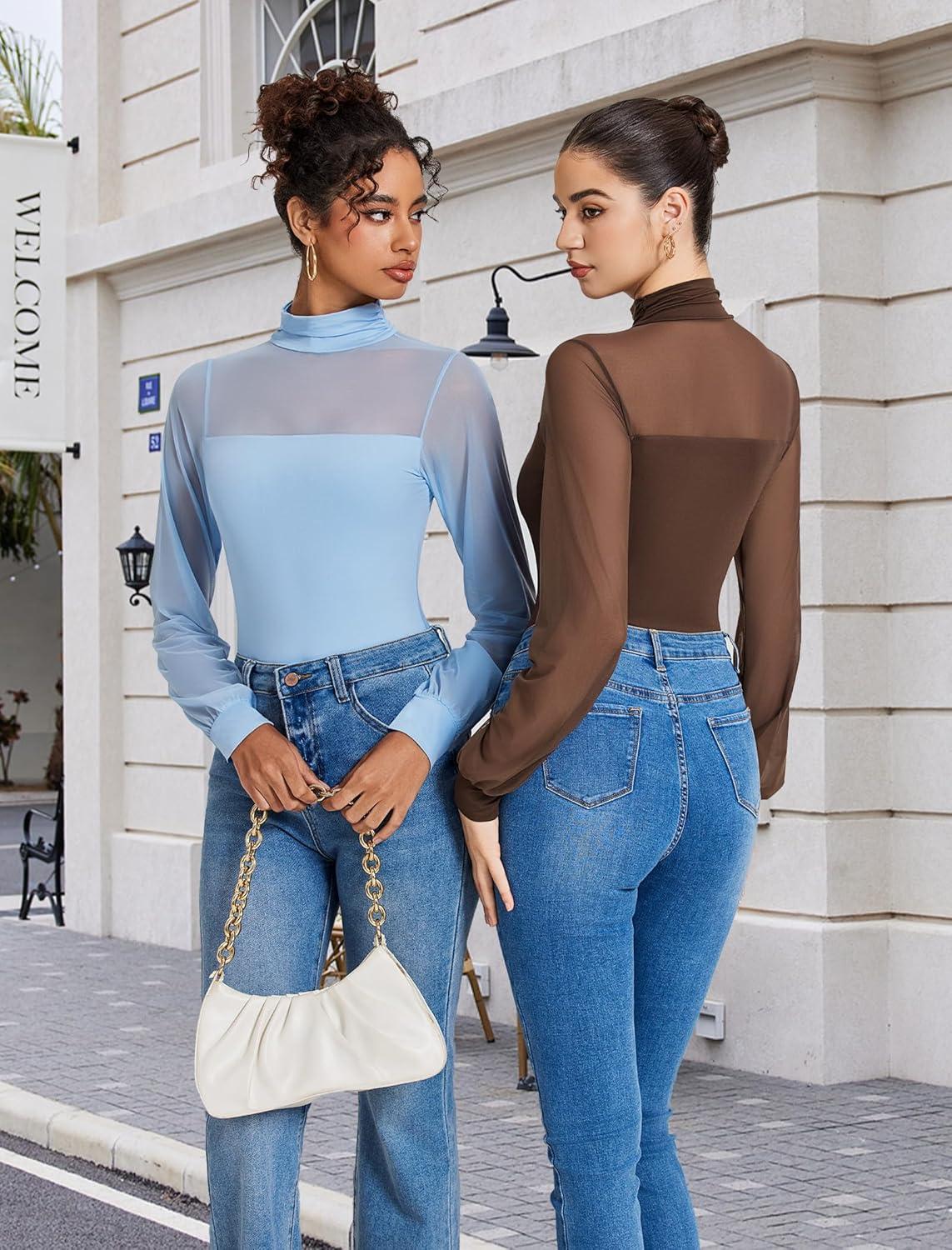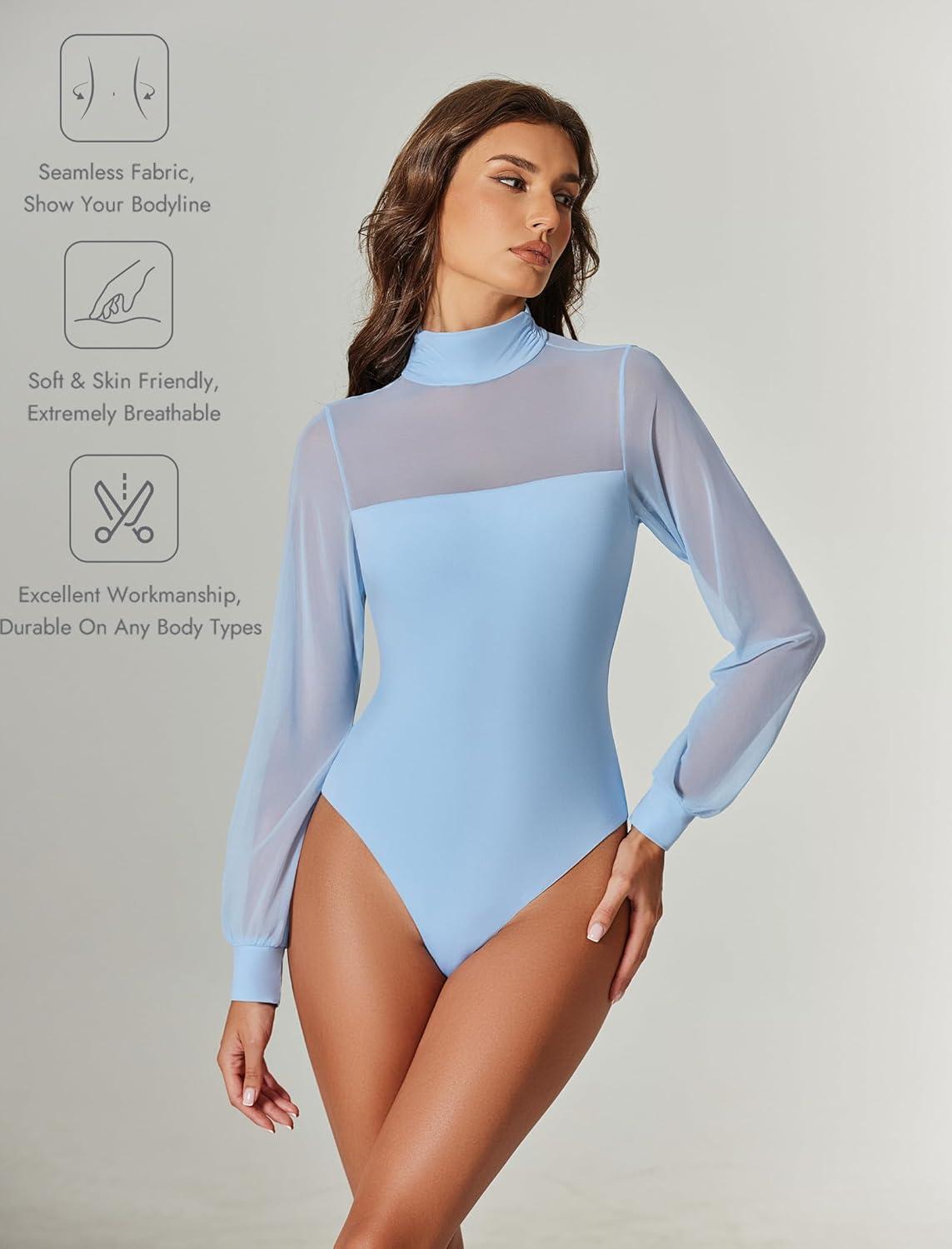 Avidlove Long Sleeve Body Suits Womens Mesh Turtleneck Bodysuit Thong Dressy Going Out Bodysuits Top Fall Outfits(Light Blue)