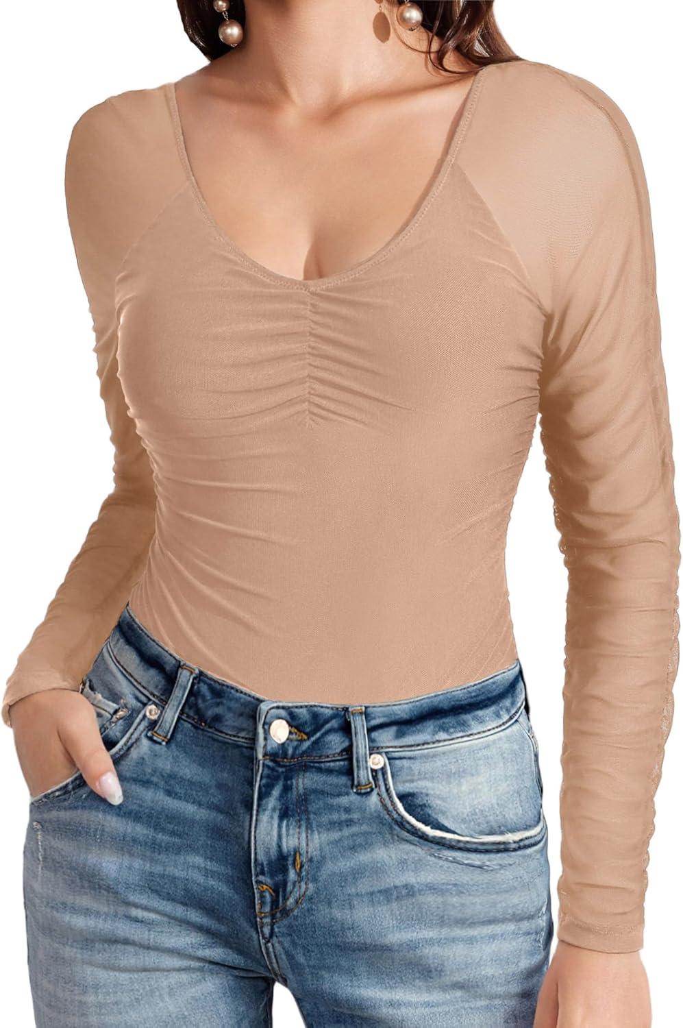 Avidlove Long Sleeve Bodysuit for Women Sexy V Neck Mesh Ruched Shapewear Body Suits Going Out Leotard Tops(Beige)
