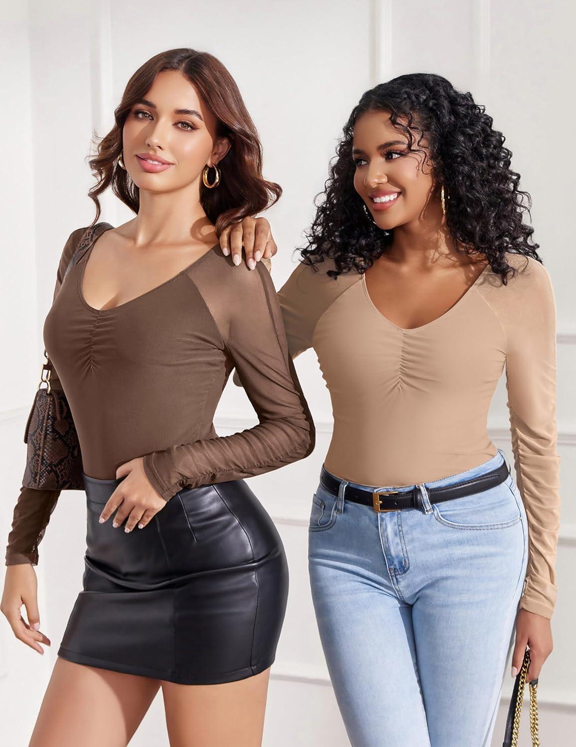 imageAvidlove Long Sleeve Bodysuit for Women Sexy V Neck Mesh Ruched Shapewear Body Suits Going Out Leotard TopsBeige