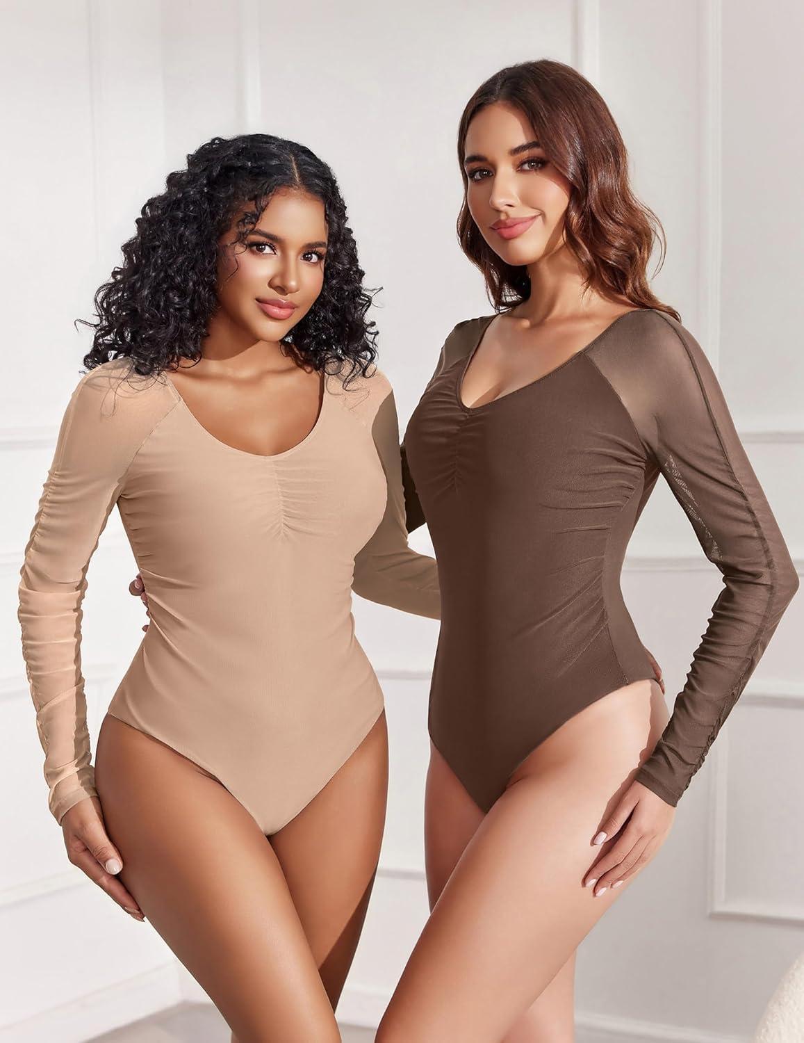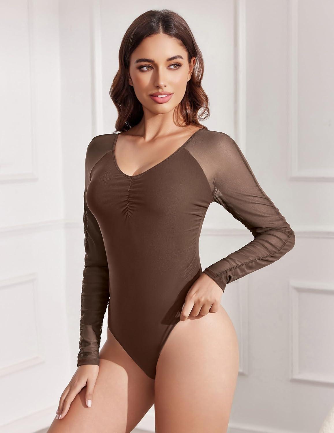 Avidlove Long Sleeve Bodysuit for Women Sexy V Neck Mesh Ruched Shapewear Body Suits Going Out Leotard Tops(Brown)