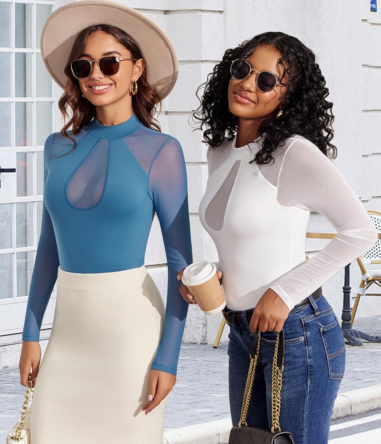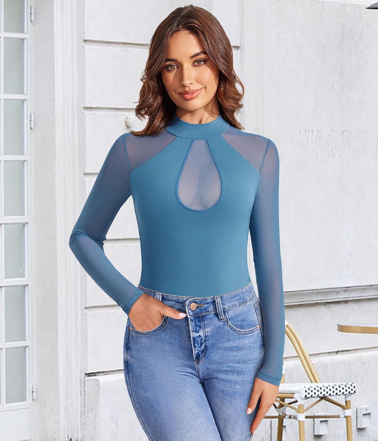 imageAvidlove Long Sleeve Bodysuits for Women Mesh Bodysuit Top Mock Neck Thong Body Suit Going Out TopsBlue