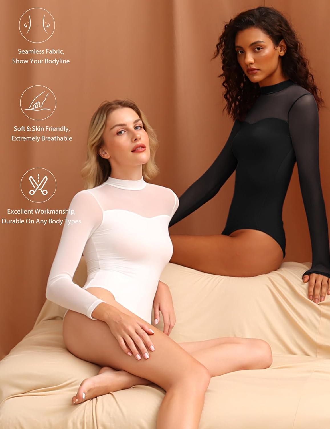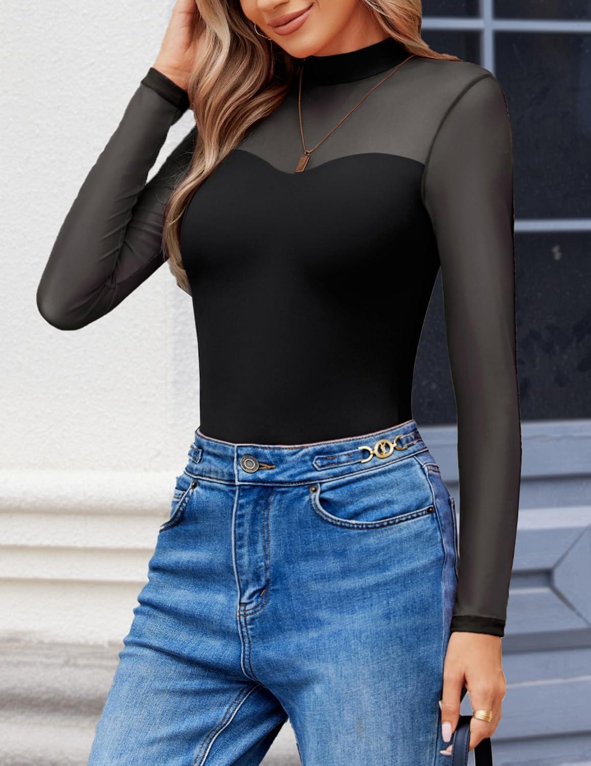 Avidlove Long Sleeve Bodysuits for Women Mock Neck Sheer Mesh Sleeve Bodysuit Double Lined Leotards Shirt Going Out Top(Black)