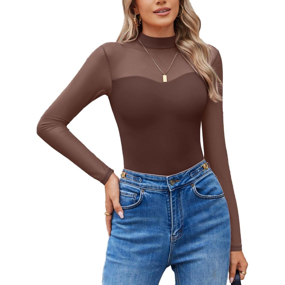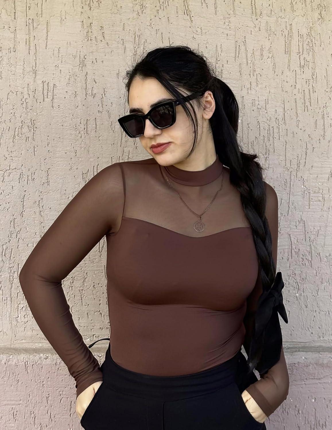 Avidlove Long Sleeve Bodysuits for Women Mock Neck Sheer Mesh Sleeve Bodysuit Double Lined Leotards Shirt Going Out Top(Brown)