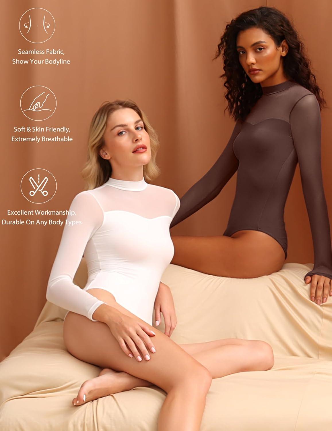 imageAvidlove Long Sleeve Bodysuits for Women Mock Neck Sheer Mesh Sleeve Bodysuit Double Lined Leotards Shirt Going Out TopWhite
