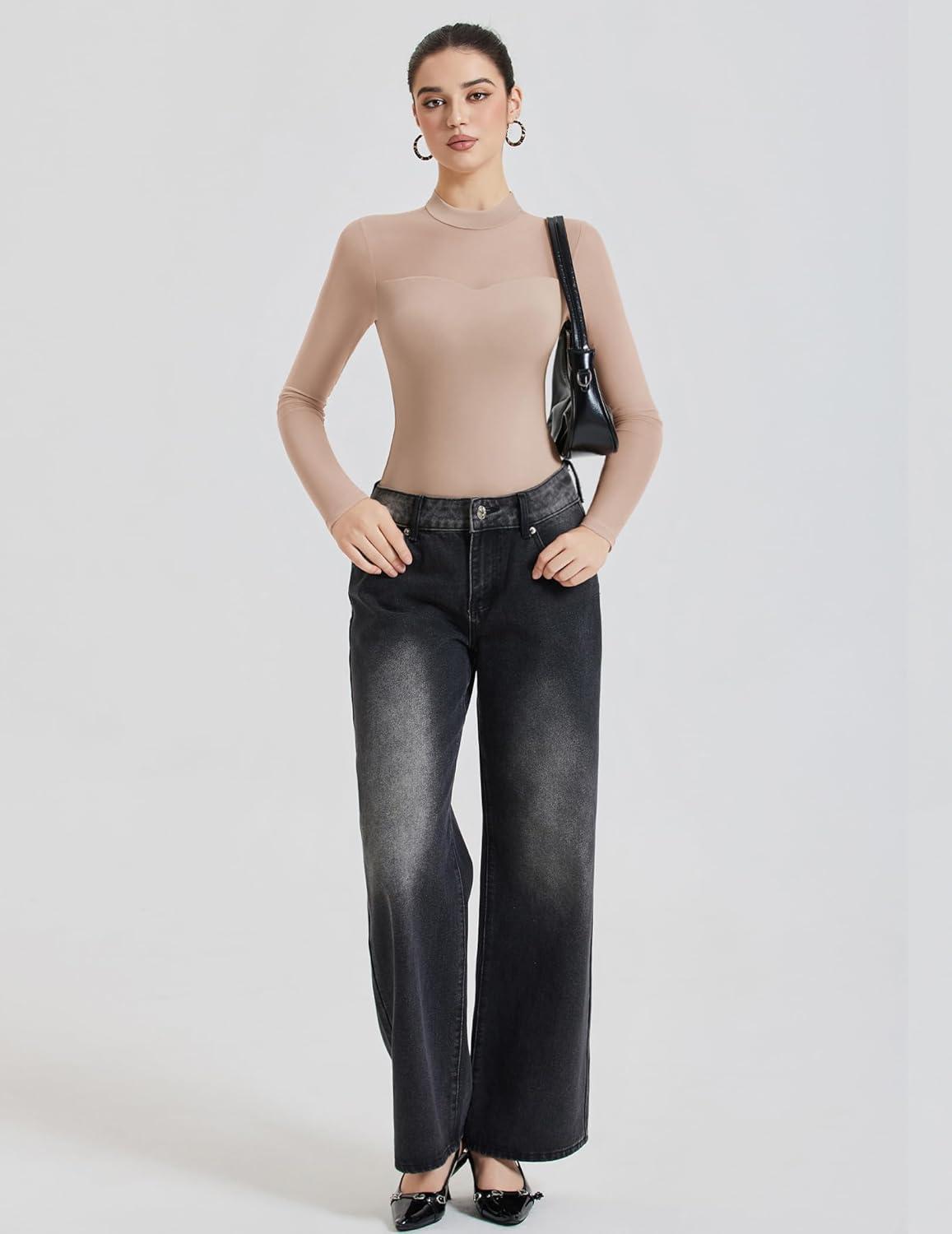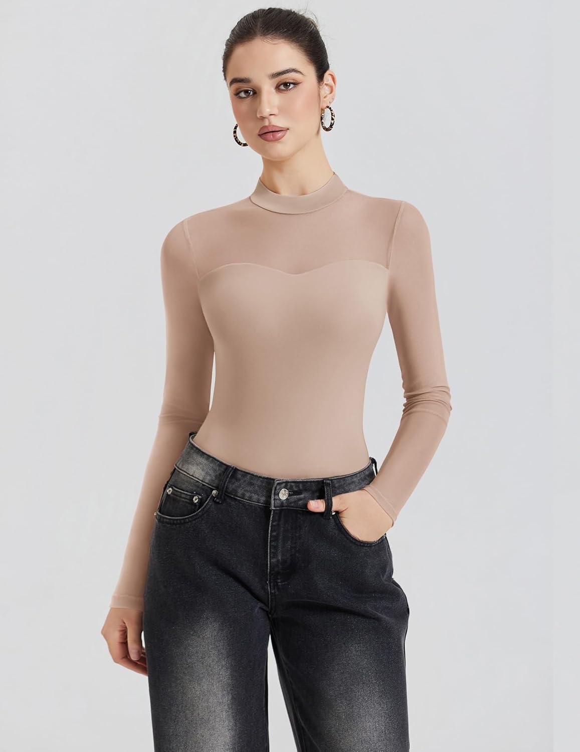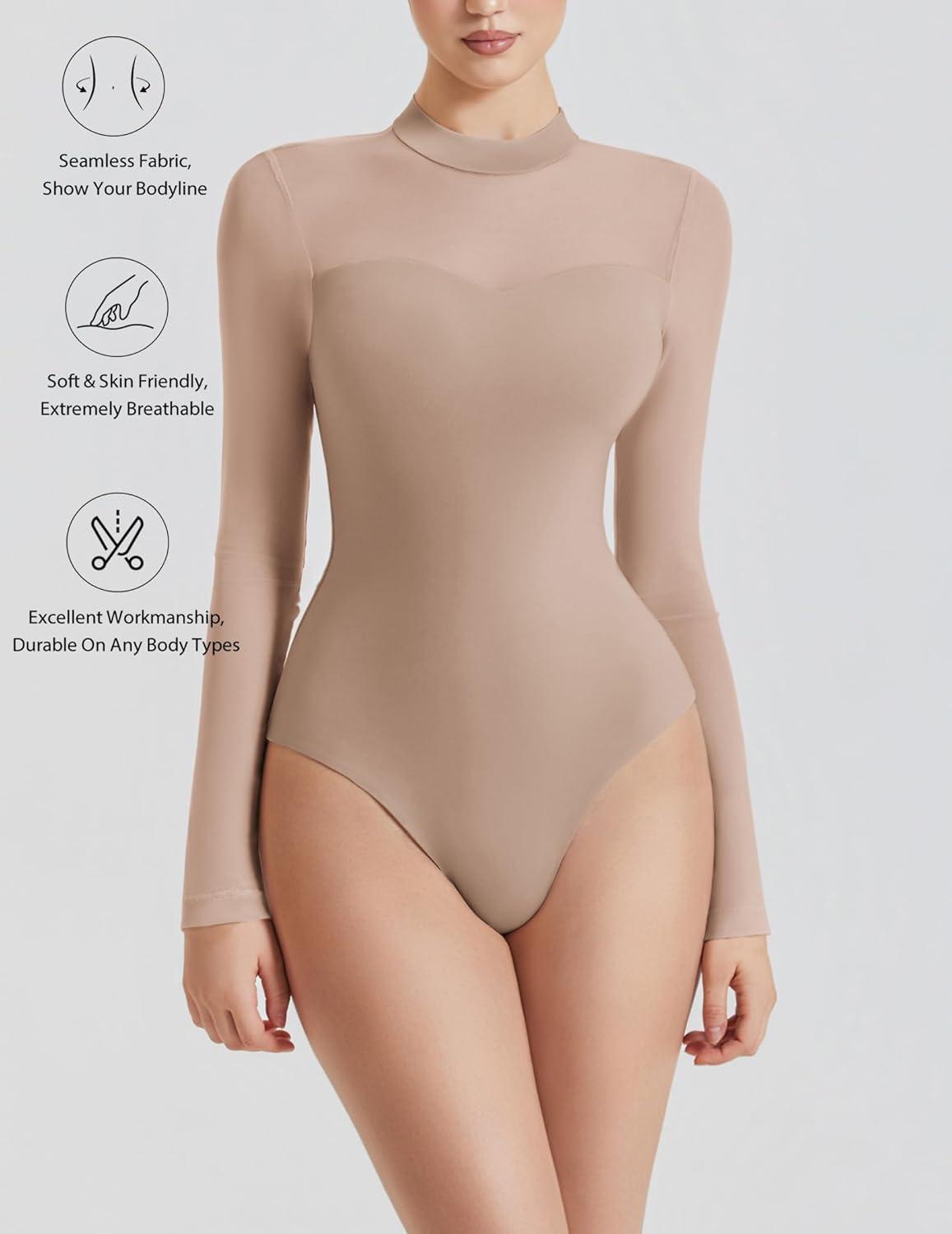 Avidlove Long Sleeve Bodysuits for Women Mock Neck Sheer Mesh Sleeve Bodysuit Double Lined Leotards Shirt Going Out Top(Nude)