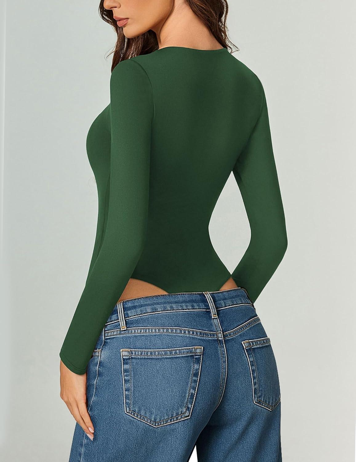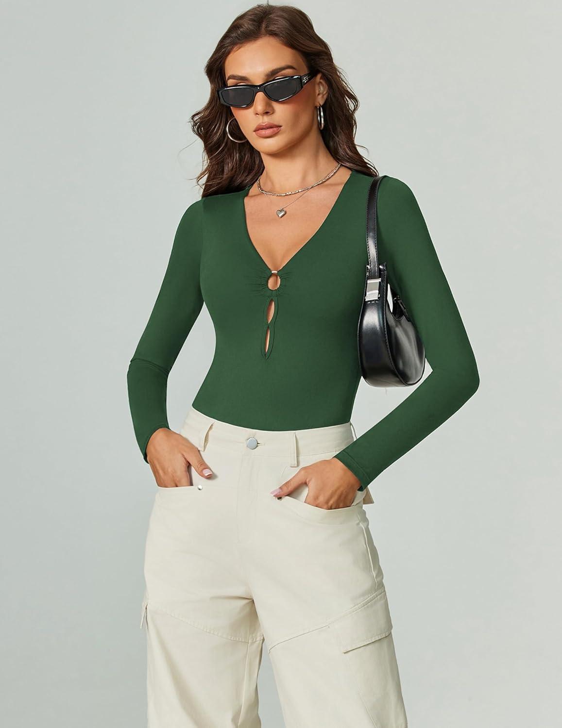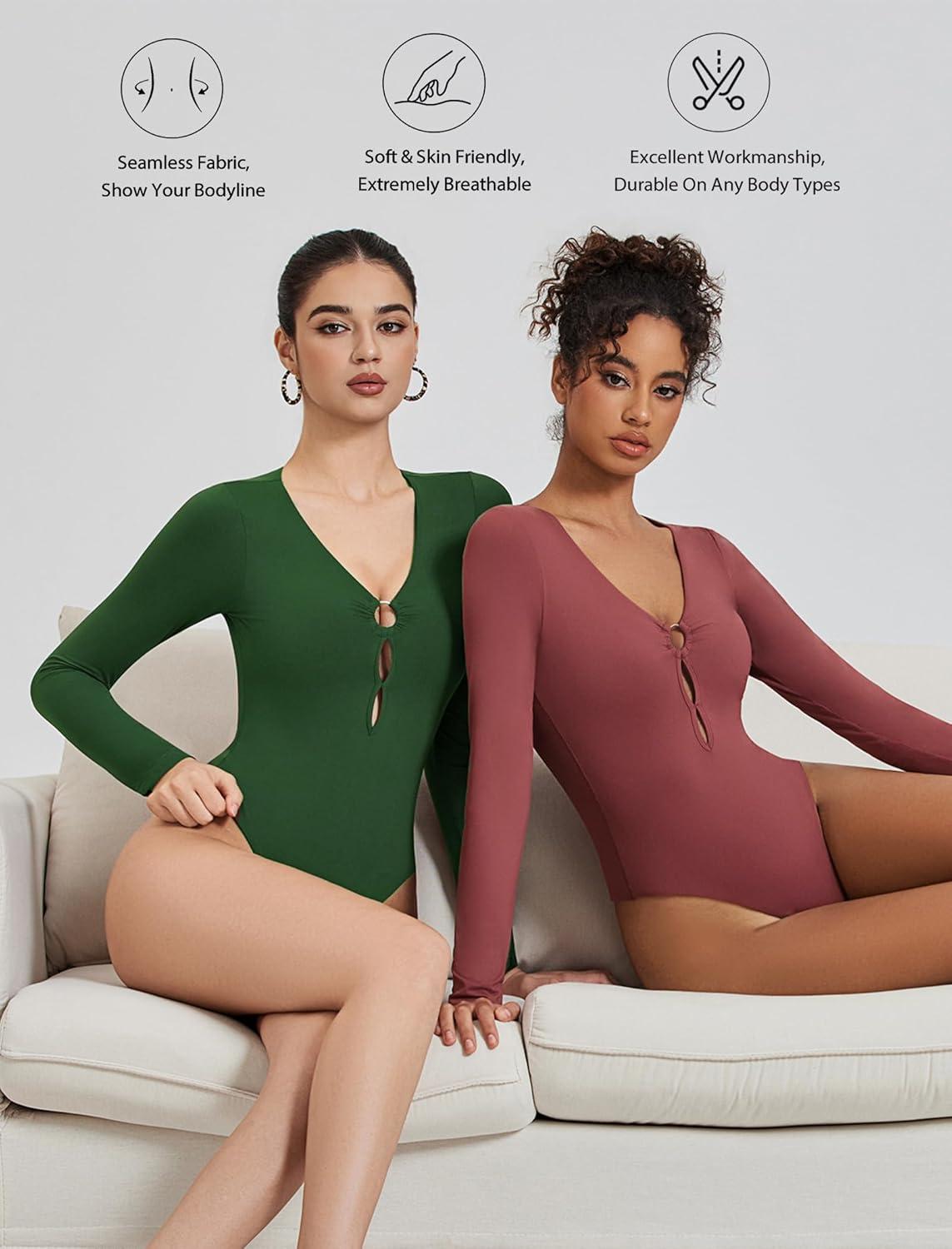 imageAvidlove Long Sleeve Bodysuits for Women Sexy Cutout Plunge Deep V Neck Thong Bodysuit Double Line Going Out Tops ORingGreen
