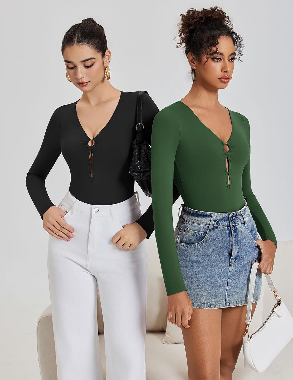Avidlove Long Sleeve Bodysuits for Women Sexy Cutout Plunge Deep V Neck Thong Bodysuit Double Line Going Out Tops O-Ring(Green)