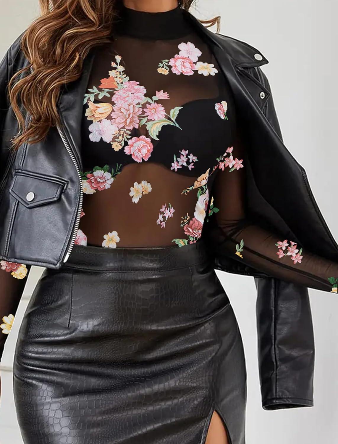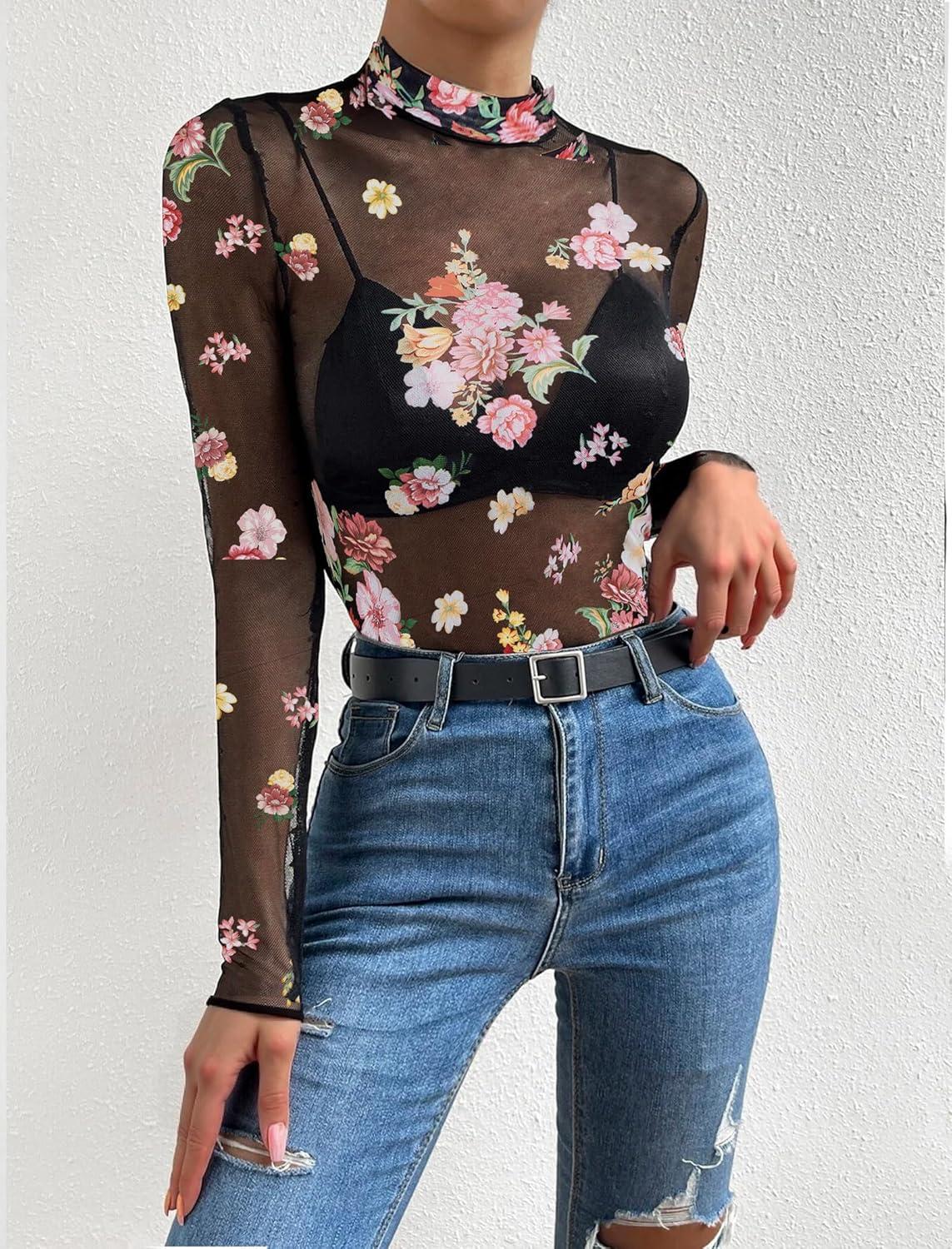 Avidlove Mesh Top for Women Long Sleeve See Through Shirt Mock Neck Sheer Blouse XS-XXL(Bf298)
