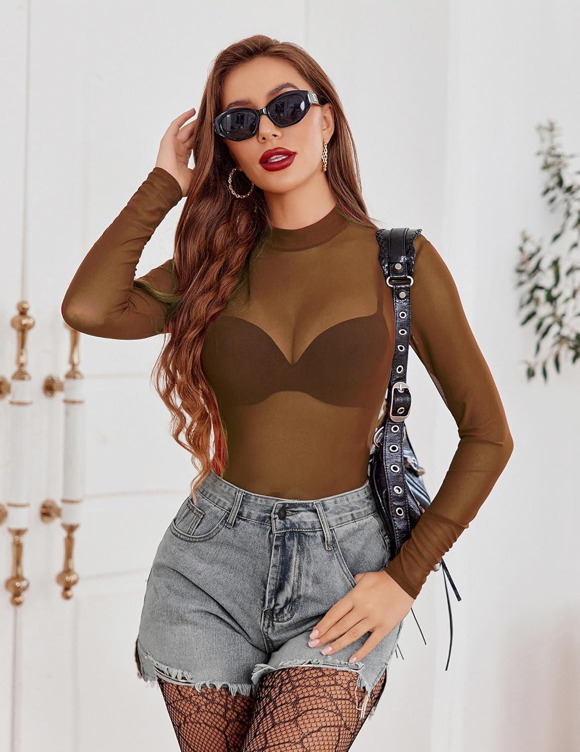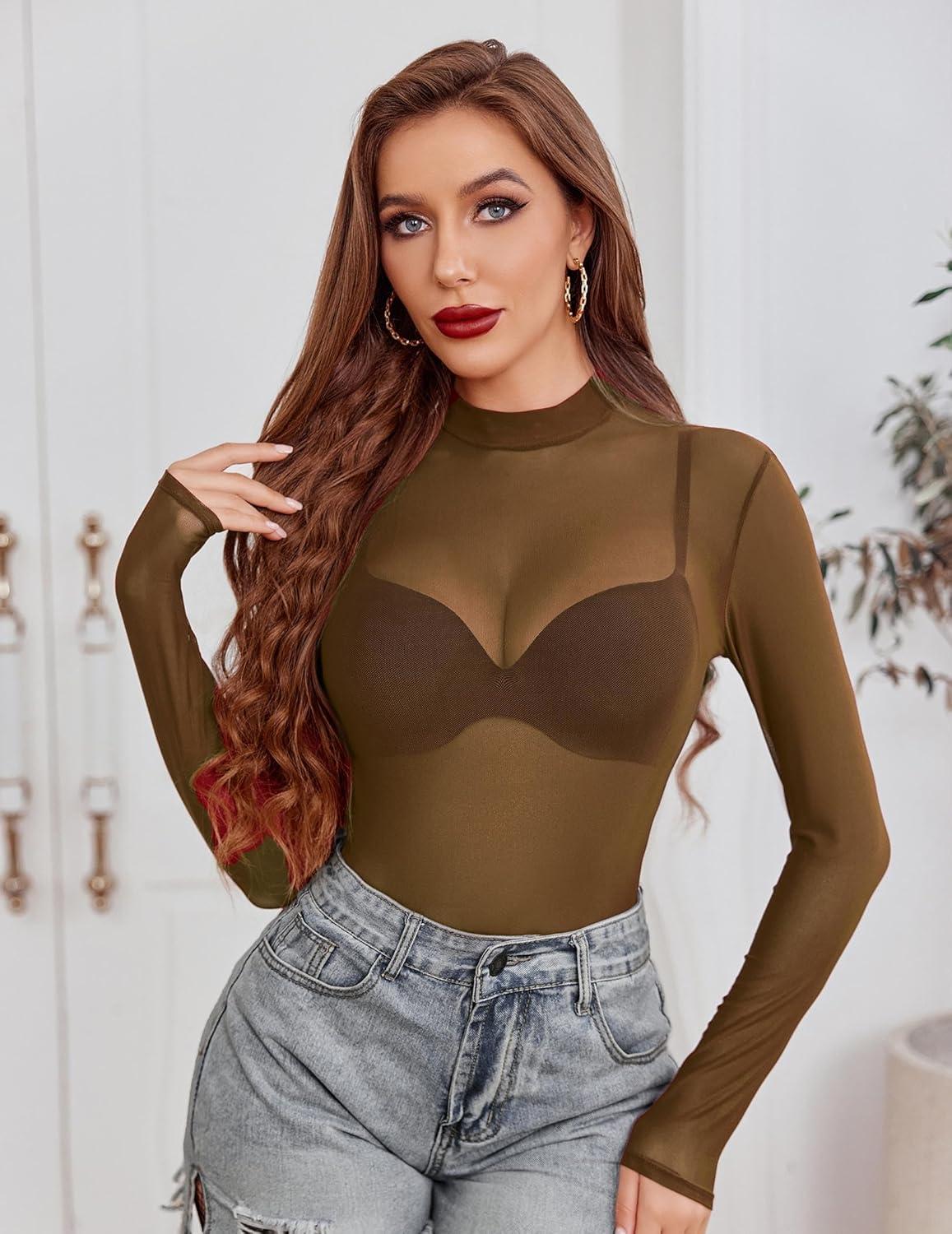 Avidlove Mesh Top for Women Long Sleeve See Through Shirt Mock Neck Sheer Blouse XS-XXL(Brown)